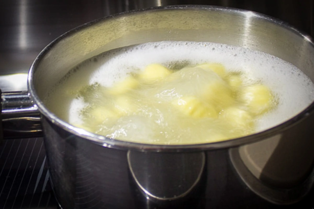 Boil gnocchi: Bring salted water to boil in medium saucepan. Put gnocchi in boiling water, bring water back to boil, and lower to medium low heat. Gently boil for 2 minutes. Drain gnocchi or remove it to a bowl with a slotted spoon and set aside.