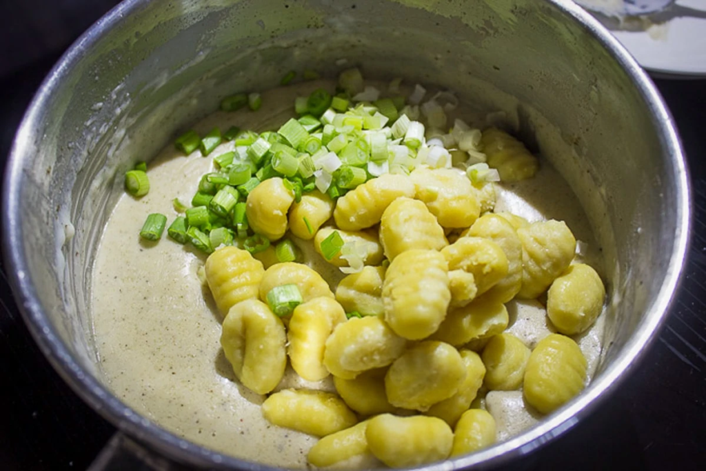 Make the cheese sauce: Melt butter on medium heat in a medium or large saucepan. Add garlic and stir for 30 seconds. Add flour and seasonings, stirring for 2 minutes. Add milk (and cream if using), whisking until slightly thickened, about 4-5 minutes. Turn off heat. Stir in grated cheese until smooth sauce is formed. If too thick, add a bit more milk (but note that sauce will thicken further with baking and standing). Taste and adjust seasonings. Stir in gnocchi and green onions.