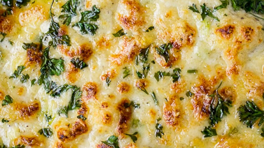 Assemble and bake/broil: Spoon mixture into prepared gratin dish. Sprinkle ¼ cup Parmesan cheese and chopped parsley over the surface. Bake for 7 minutes, then broil for 3 minutes to brown, watching to ensure it doesn’t burn. Let stand for a few minutes (sauce will thicken more) and serve creamy casserole with toothpicks as an appetizer or as a regular side or main dish.