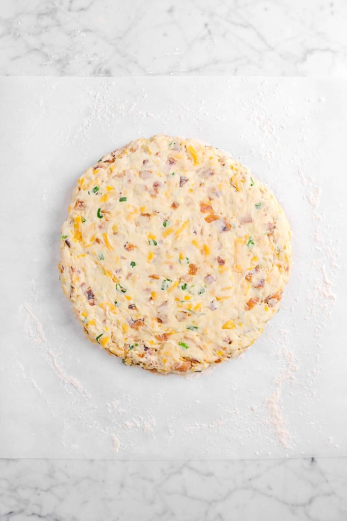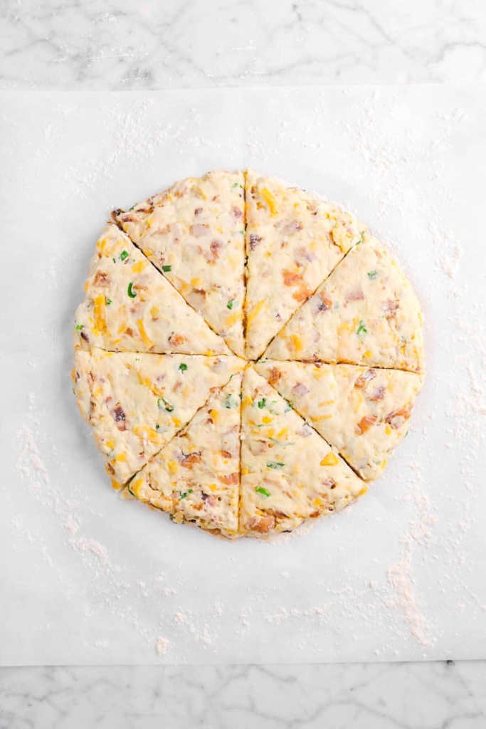 Line 2 large baking sheets with parchment paper. Set aside. In a small bowl, beat buttermilk and eggs together. Set aside. Sift flour, baking powder, and salt into a large bowl. Grate butter into flour. Stir gently. Add bacon, cheddar, and chives. Mix gently and thoroughly. Add buttermilk mixture. Mix only until ingredients are combined. DO NOT KNEAD! (The dough will be sticky.) Divide dough in half. Take half of dough and form it into a ball. Place on floured surface. Gently pat out into a circle. Cut into 8 wedges. Repeat with other half of dough. Place on prepared baking sheet. Bake for about 15-18 minutes, until light golden brown.