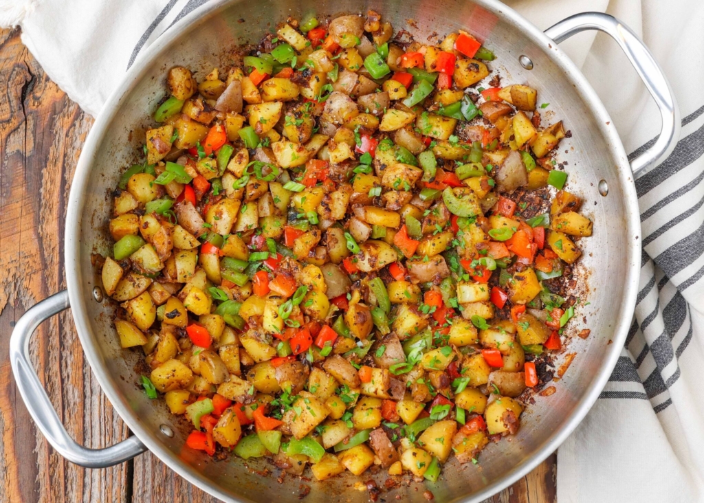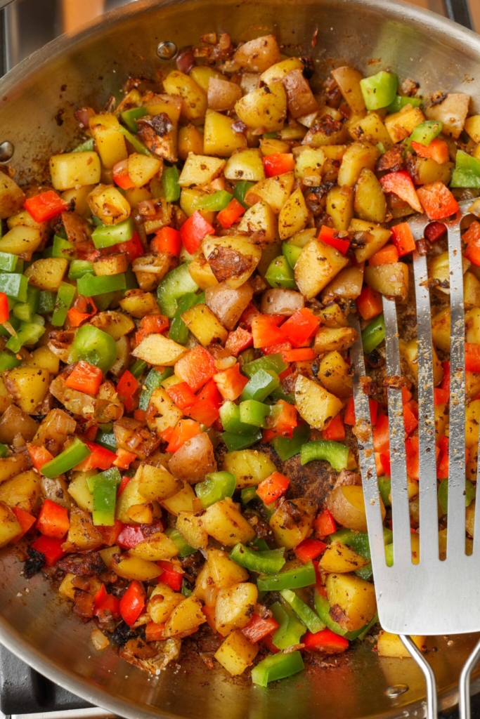 Potatoes, red and green bell peppers, and yellow onions are combined in a colorful and flavorful skillet that is perfect for any meal.