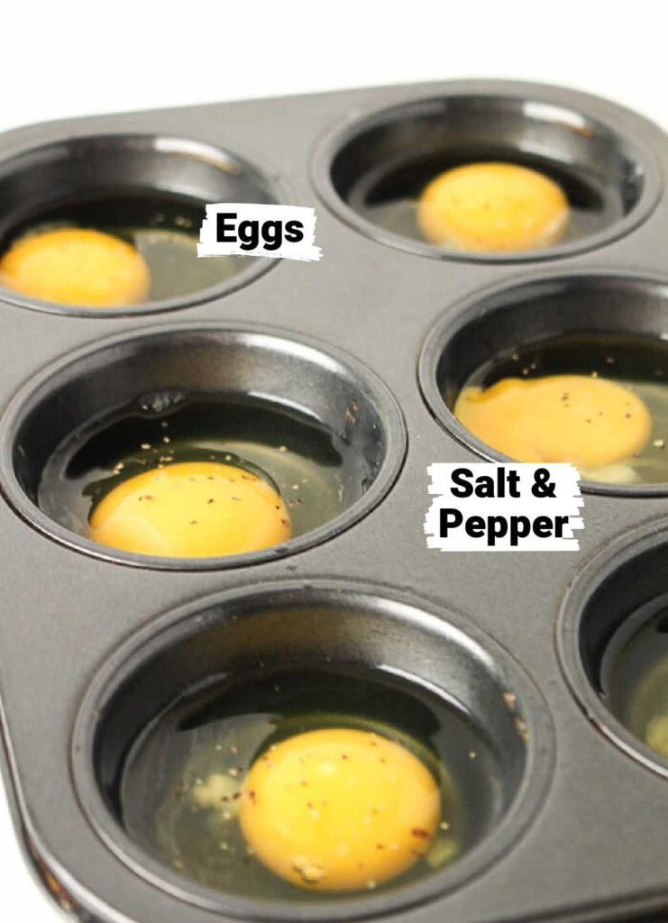 Preheat oven to 350F. Crack eggs into a lightly greased muffin tin. Sprinkle a bit of salt and pepper onto the eggs.