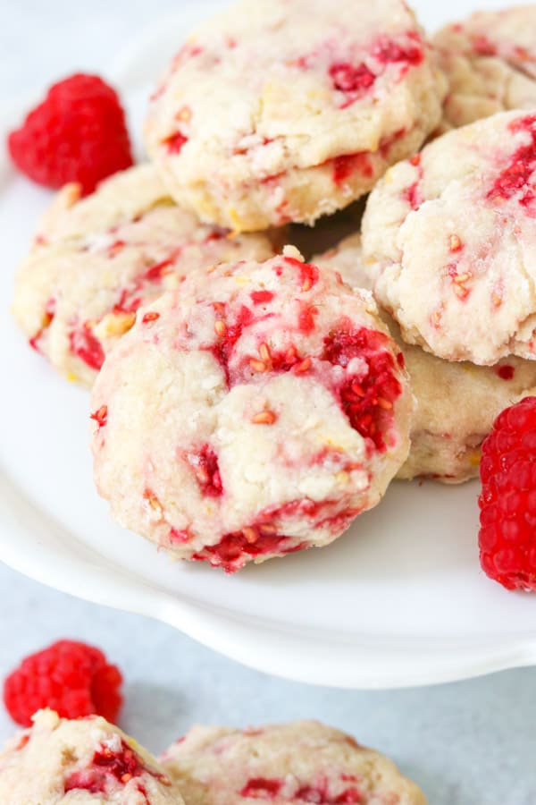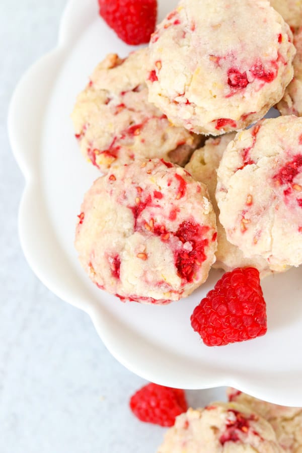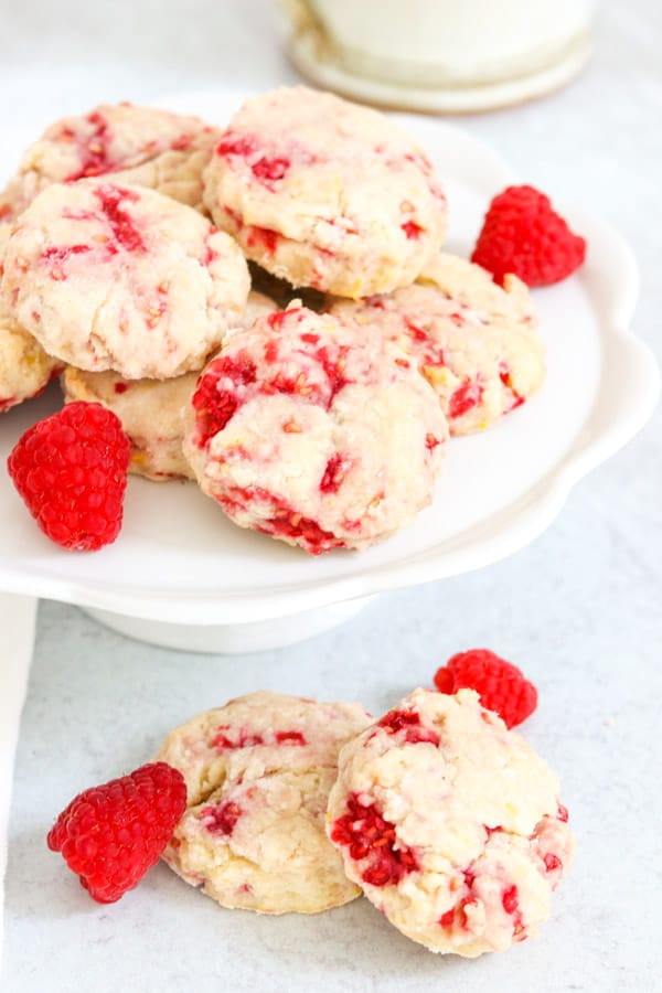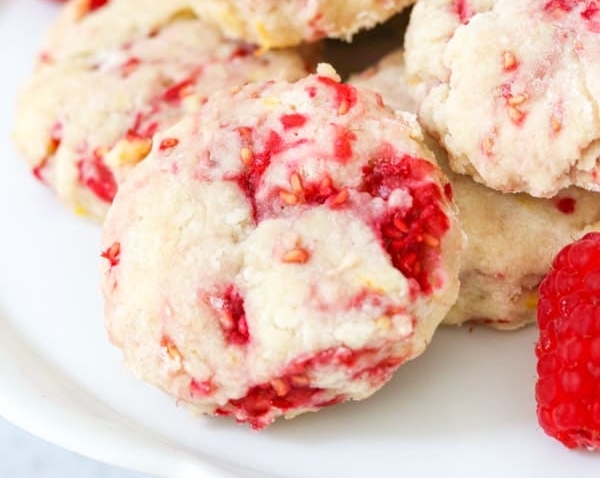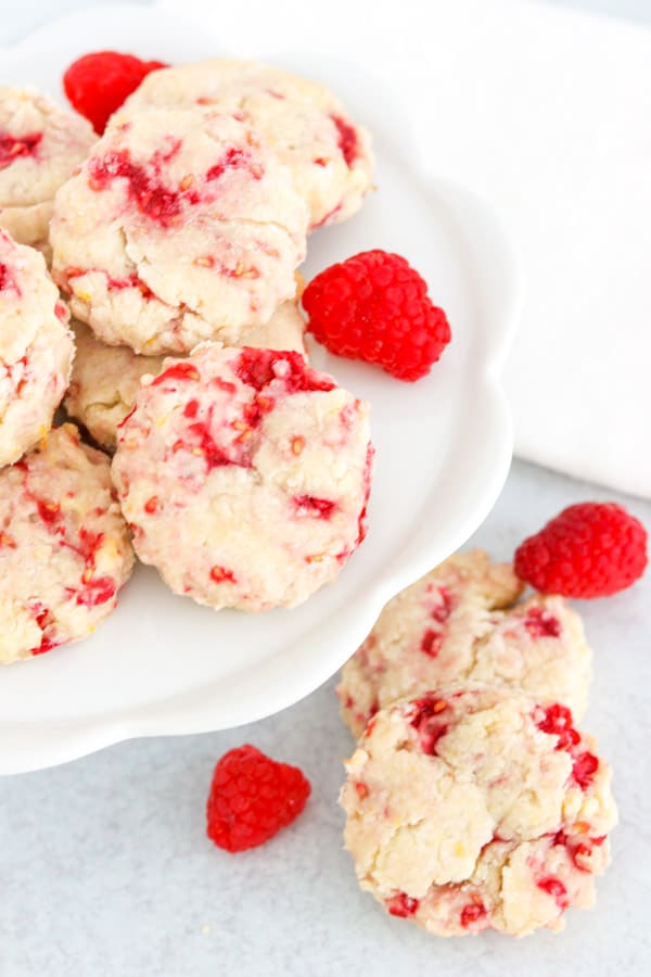 Preheat oven to 425°F. and prepare a baking sheet by placing a piece of parchment over it. Sift flour, sugar, salt, and baking powder into a large bowl. Add the lemon zest and toss to coat. Using a pastry blender, or two knives, cut in butter and cream cheese until the mixture resembles coarse meal. Add egg, milk and raspberries and mix with a fork until everything comes together to form a soft dough. Roll out onto a lightly floured surface and pat into a circle about a 1/2-inch thick. Cut into rounds with a 2-inch cookie or biscuit cutter. Place onto prepared baking sheet, about 2 inches apart and bake for 12 minutes or until lightly golden. Transfer to a wire rack and allow to cool 1-2 minutes before serving warm.