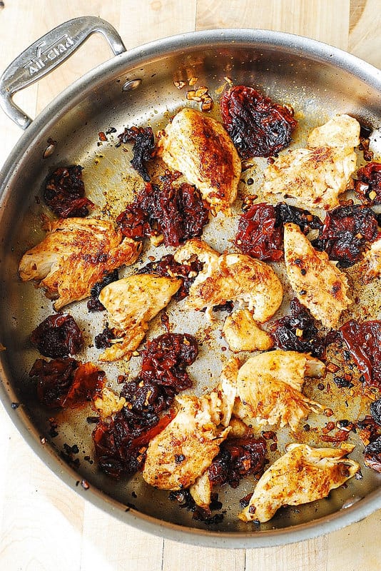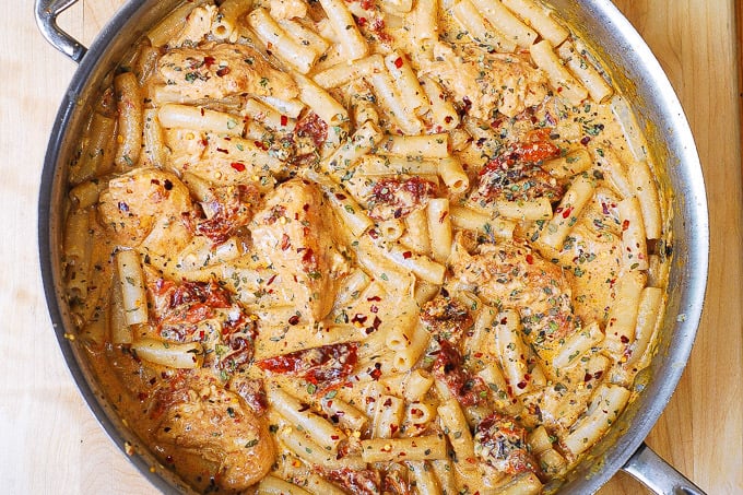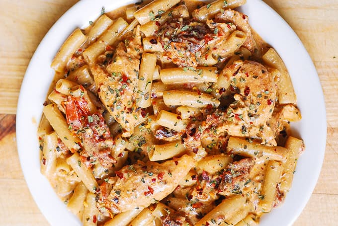 In a large skillet, sauté garlic and sun-dried tomatoes (drained from oil) in 2 tablespoons of olive oil (reserved from the sun-dried tomatoes jar) for 1 minute on medium heat until the garlic is fragrant. Remove the sun-dried tomatoes from the skillet, leaving the olive oil. Add sliced chicken (salted and lightly covered in paprika for color) and cook on high heat for 1 minute on each side. Remove from heat. Cook pasta according to package instructions. Reserve some cooked pasta water. Drain the pasta. Slice sun-dried tomatoes into smaller pieces and add them back to the skillet with chicken. To make creamy pasta sauce, add half-and-half (see substitution for half-and-half in the Recipe Notes section below) and Mozzarella cheese to the skillet, and bring to a gentle boil. Immediately reduce to simmer and cook, constantly stirring, until all cheese melts and creamy sauce forms. Add cooked and drained pasta to the skillet with the cream sauce, and stir to combine. Add 1 tablespoon of basil, and at least ¼ teaspoon of red pepper flakes. Stir to combine. If the creamy sauce is too thick: Add about ½ cup of reserved cooked pasta water to the skillet to thin it out. Do not add all of pasta water at once – you might need less or more of it. Season the chicken pasta with salt, and more red pepper flakes, to taste, if needed. Let it simmer for a couple of minutes for flavors to combine.