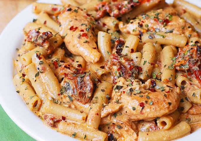Italian-inspired dinner with the best homemade creamy pasta sauce! The sun-dried tomato pasta sauce is made from scratch using basil, red pepper flakes, garlic, paprika, cream, and shredded Mozzarella cheese.