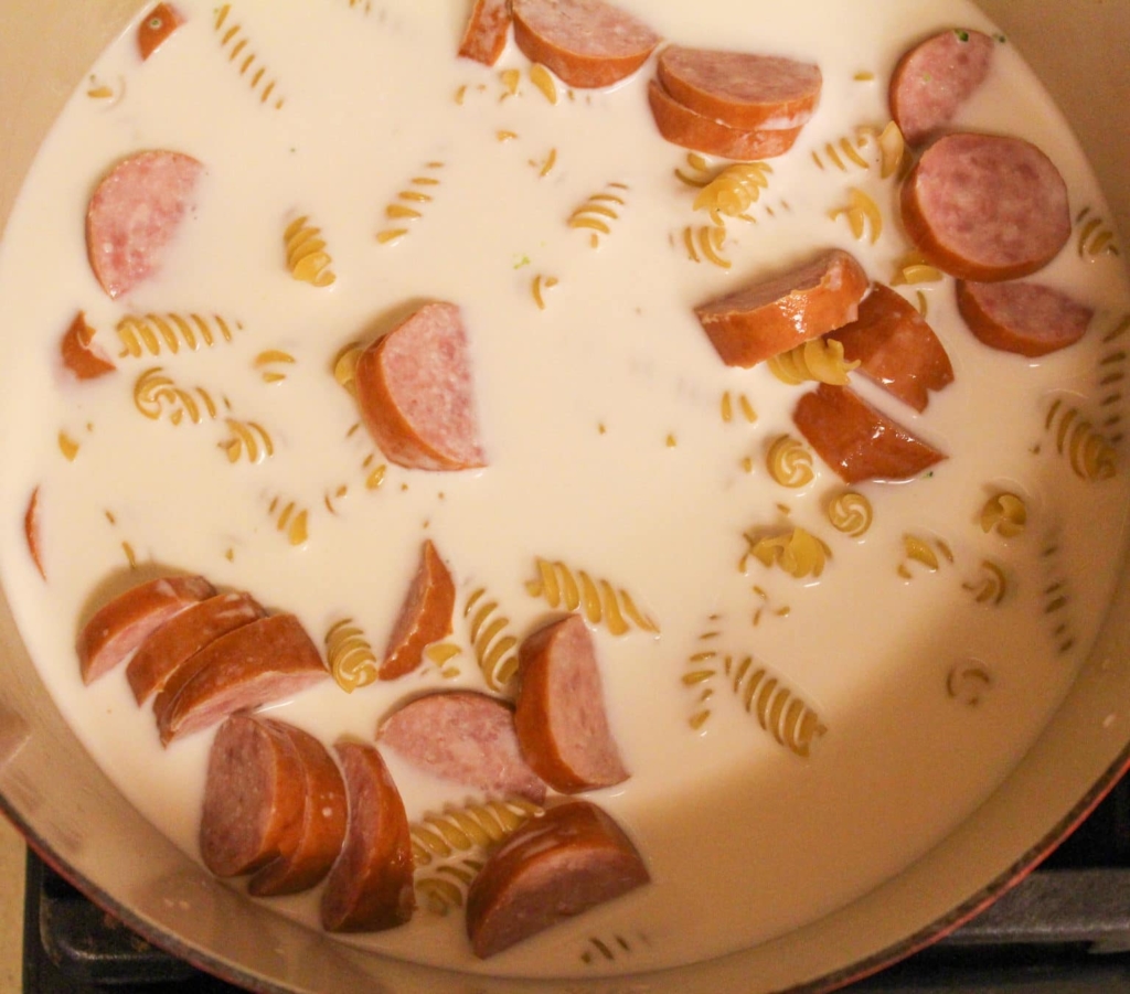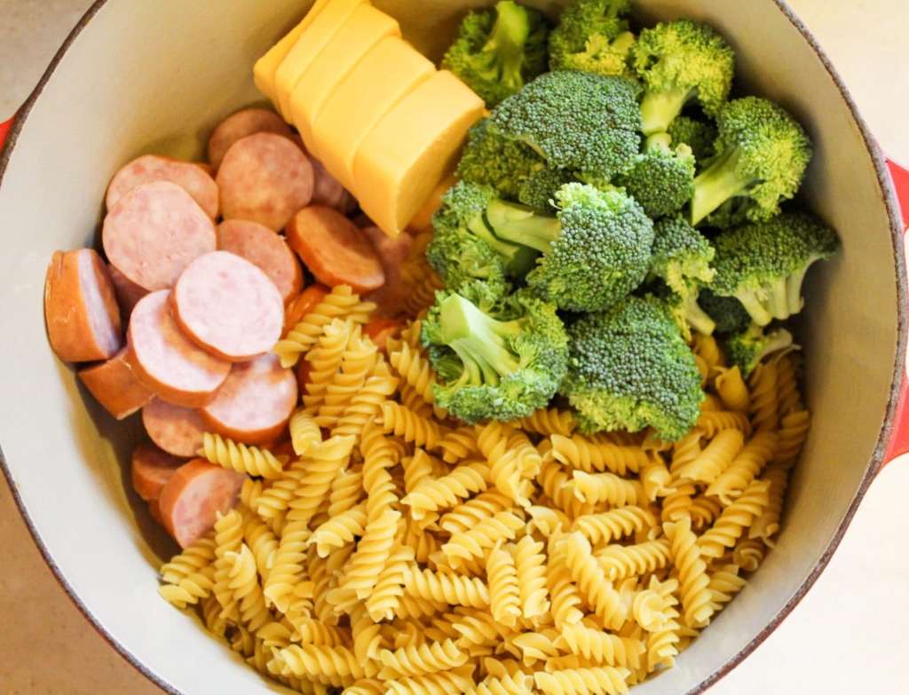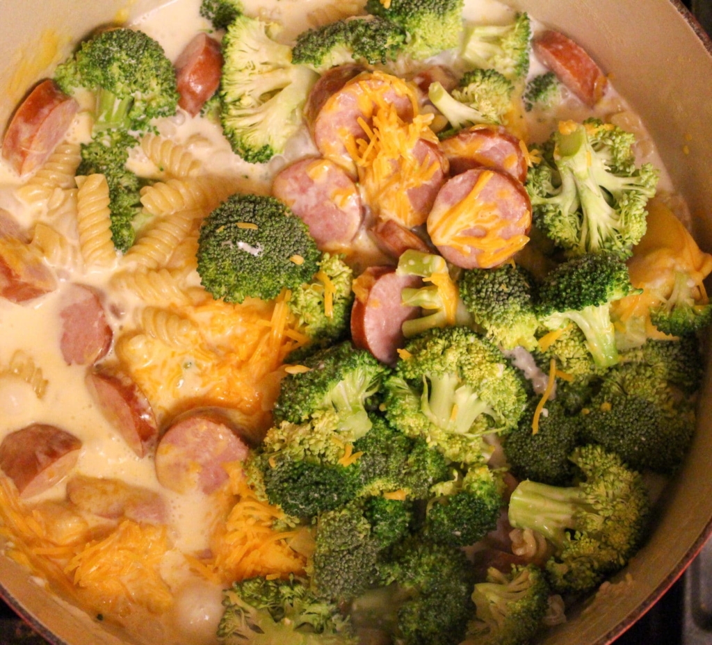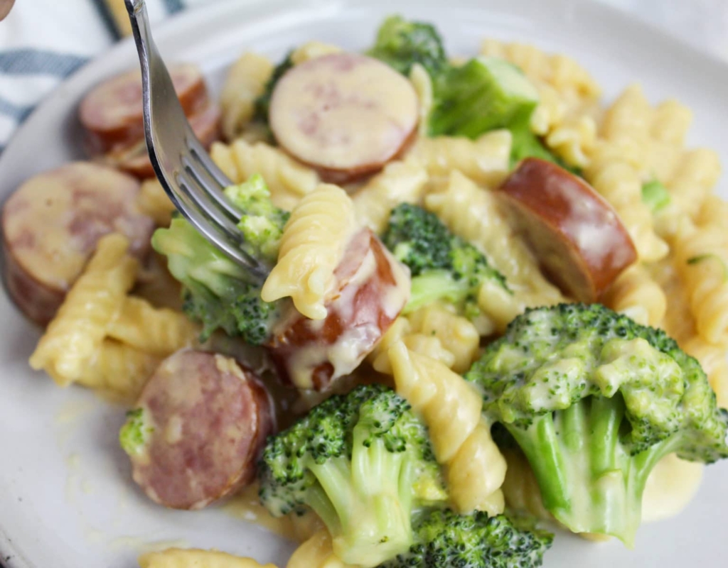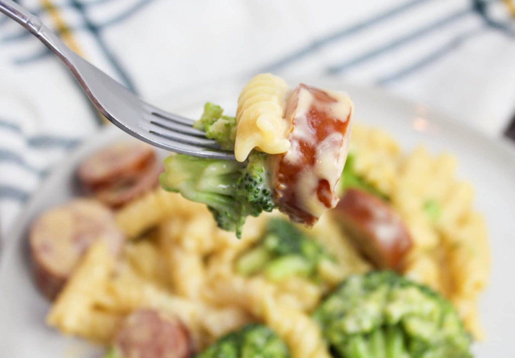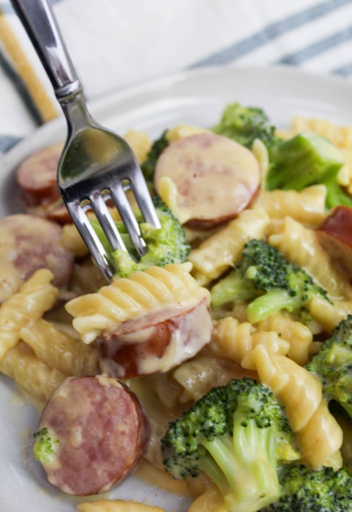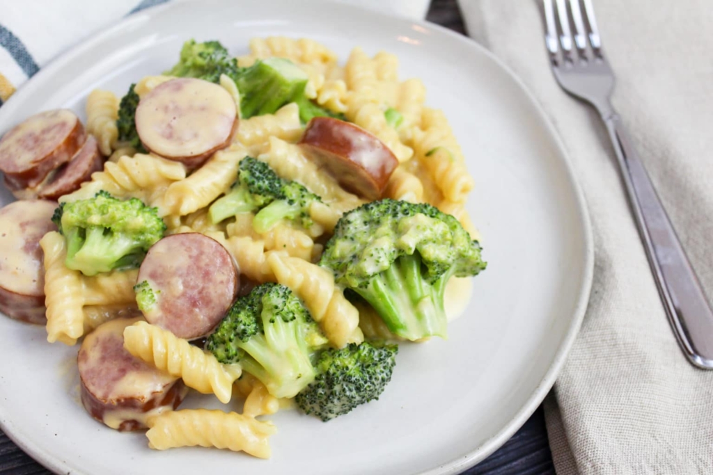 Creamy and cheesy pasta cooked on one pot with fresh broccoli and savory smoked sausage. This pasta cooks in 30-minutes and is a delicious, and family friendly, weeknight meal.