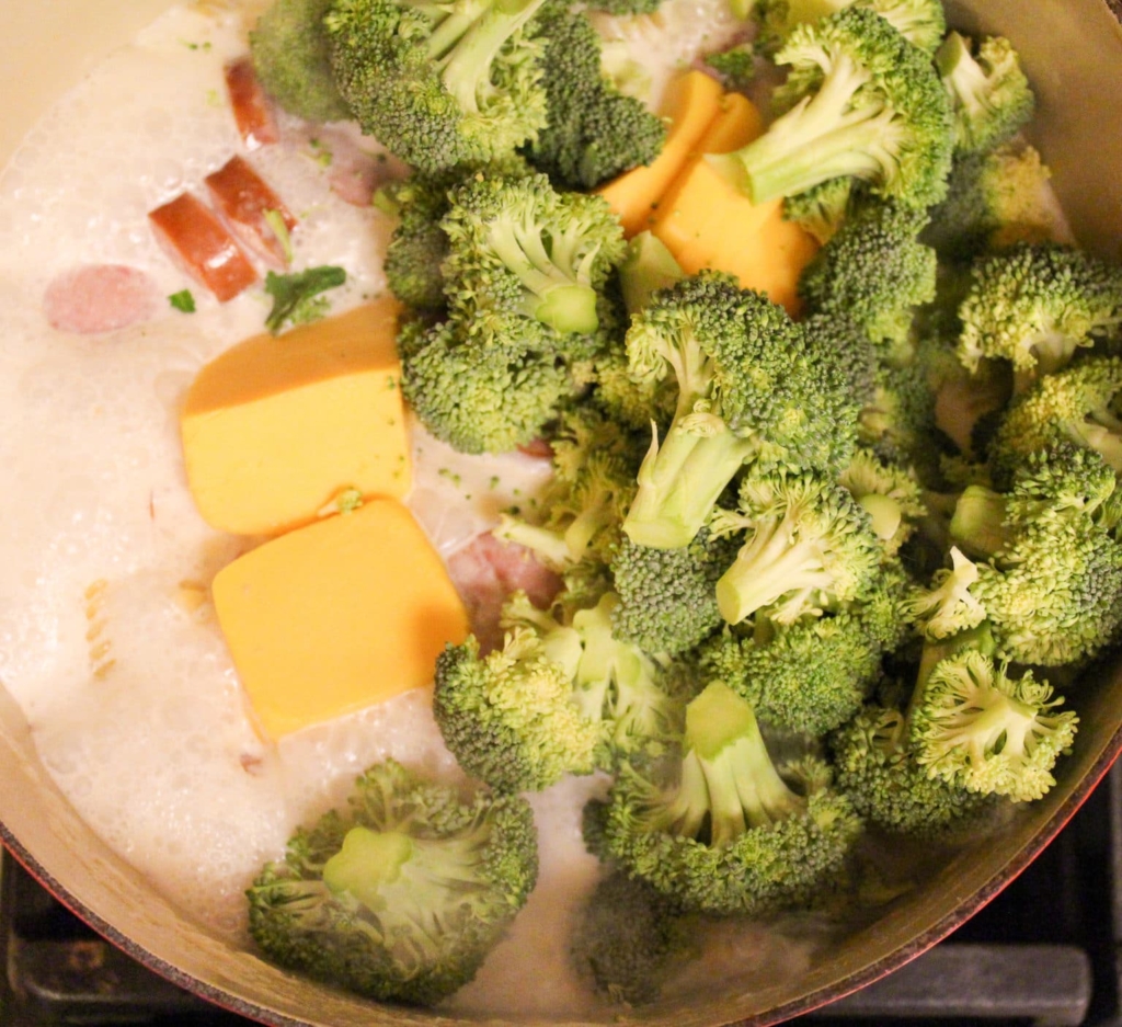 Place pasta, sausage, broth, cream, and milk into a pot. Turn heat to medium. Simmer the pasta till tender, about 10 minutes. Make sure to stir the pasta every 3-4 minutes to prevent it from sticking. Add broccoli and cheeses. cook for an additional 2-3 minutes to allow cheese to melt and broccoli to become tender. Serve and enjoy.