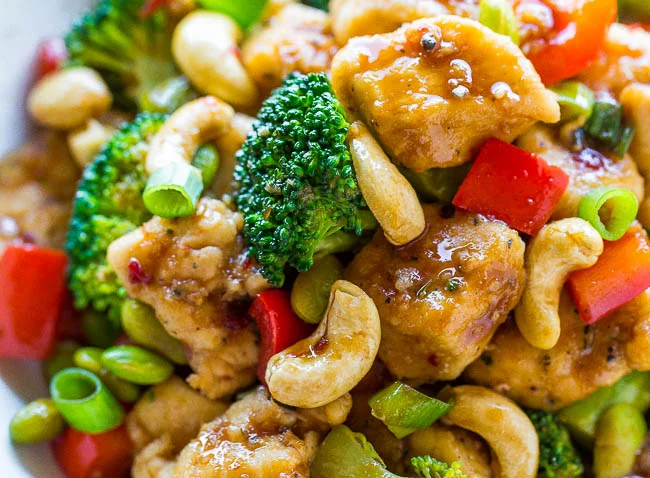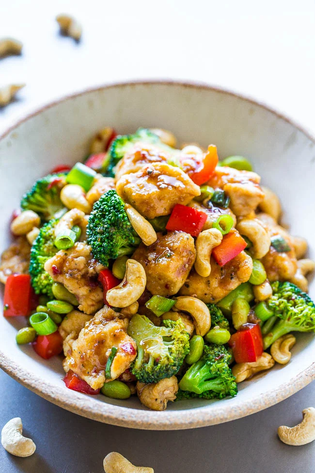 Juicy chicken, crisp-tender vegetables, and crunchy cashews coated with the best garlicky soy sauce!! Skip takeout and make your own restaurant-quality meal that’s easy, ready in 20 minutes, and healthier than the restaurant version!