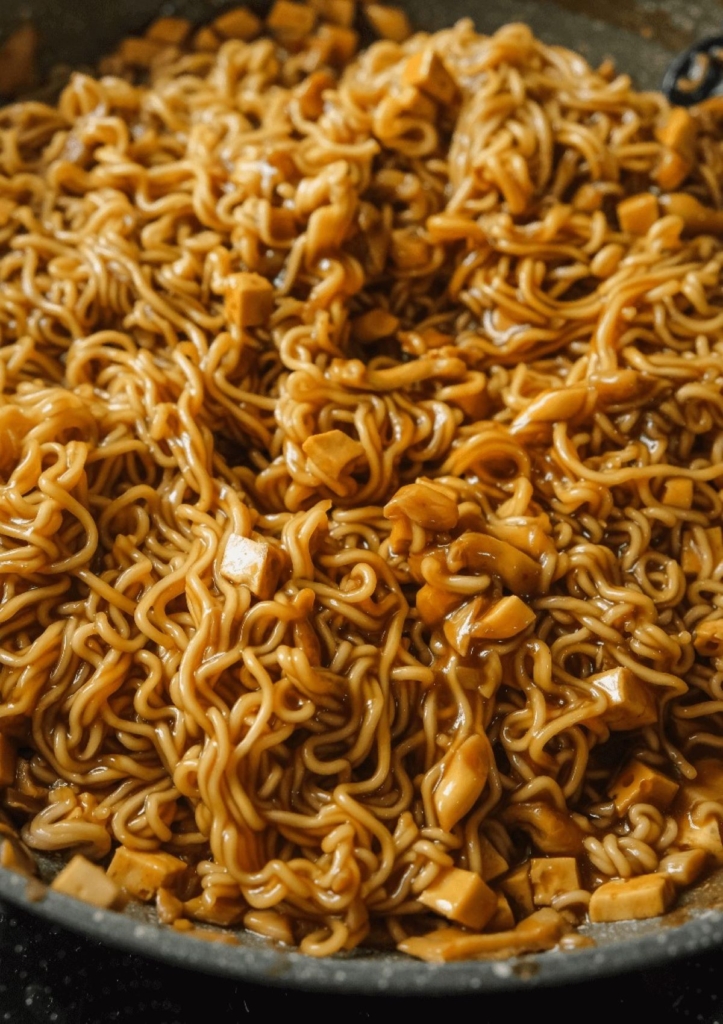 Mix all the sauce ingredients until well incorporated. Feel free to adjust the sauce ingredient measurements depending on your desired sweetness, saltiness, sourness, and spice. Afterwards, set aside. (Note: you may have a sauce that’s more on the red side in terms of color if using hot sauce.) Also, if you plan to use way more veggies and more noodles, you can double the sauce recipe to make sure your noodles still turn out saucy! Boil some water in a small pot over high heat. Once it boils, add in the ramen or other noodles of choice. Half cook the noodles until still very chewy or have that good bite in the middle. You can cook it 2-3 minutes less than the package instructions, This way it won’t overcook in the sauce later on. Instant ramen noodles cooked in a pot. Drain out the water or strain the noodles then set aside. You can also opt to run them through cold water to stop the noodles from cooking down further and also remove excess starch. While the noodles are cooking, heat a pan over medium high. Add a little oil. Sauté the veggies, mushrooms, or tofu for a few minutes until cooked to your liking. Afterwards, give the sauce a good mix again. Make sure none of the starch is stuck at the bottom. Pour in the sauce into the pan. Leave the sauce to simmer for 2-3 minutes over medium heat or until the sauce starts to thicken from the starch. Continuously mix the sauce to prevent it from sticking to the pan. When the sauce has slightly thickened, add in the noodles to the pan. Mix the noodles well to coat in the sauce. Cook the noodles over medium high heat until the noodles absorb some of the sauce and the sauce is thick, around 3 minutes. Taste the noodles and feel free to season with some more soy sauce, sweetener, soy sauce, and pepper if needed. Garnish with sesame seeds and spring onions, if desired. Enjoy immediately while hot!