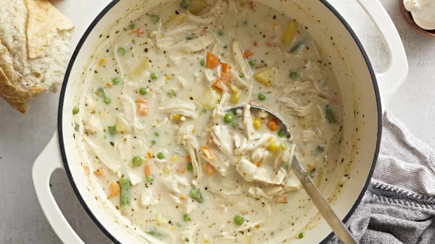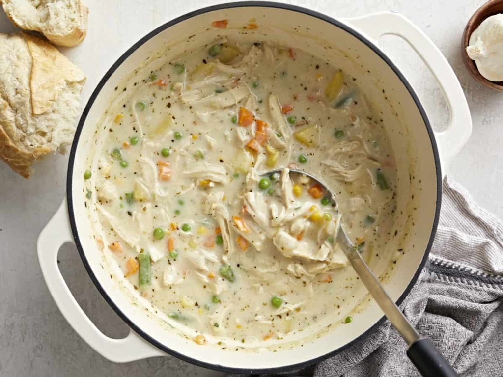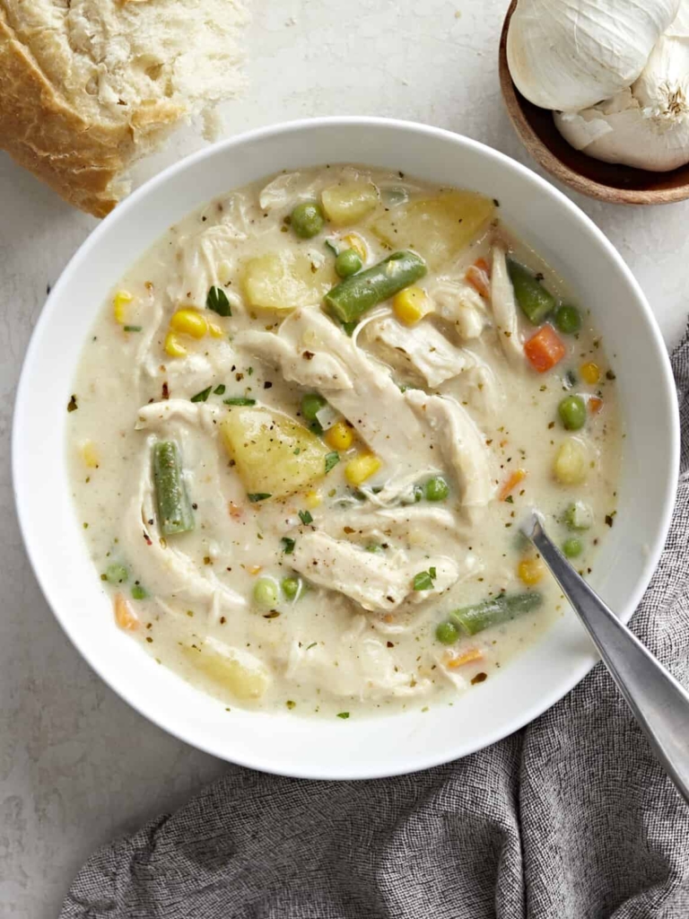 Dice the onion, peel & chop the potatoes into 1 inch chunks, and mince the garlic cloves. Add the potatoes to a bowl of cool water to prevent them from oxidizing and turning brown. In a Dutch oven or large pot, melt the butter over medium heat. Sauté the onion until translucent, about 4 minutes. Add the minced garlic and sauté for an additional 30 seconds. Sprinkle the flour into the pot over the onions and garlic. Stir and allow the flour to cook for about 1-2 minutes. Add Italian seasoning, salt, pepper, chopped potatoes, and chicken broth to the pot. Stir well to dissolve the flour and any browned bits off the bottom of the pot. Place a lid on the pot and bring it up to a boil. Once boiling, turn the heat down to medium and let the potatoes cook, stirring occasionally, for 10-12 minutes or until the potatoes are fork tender. Remove the lid and add the cooked chicken, frozen mixed vegetables, and heavy cream to the pot. Stir well, place the lid back on, and continue to simmer for 5 more minutes. Taste to see if any additional seasoning is needed. Garnish with fresh parsley (optional) and enjoy!