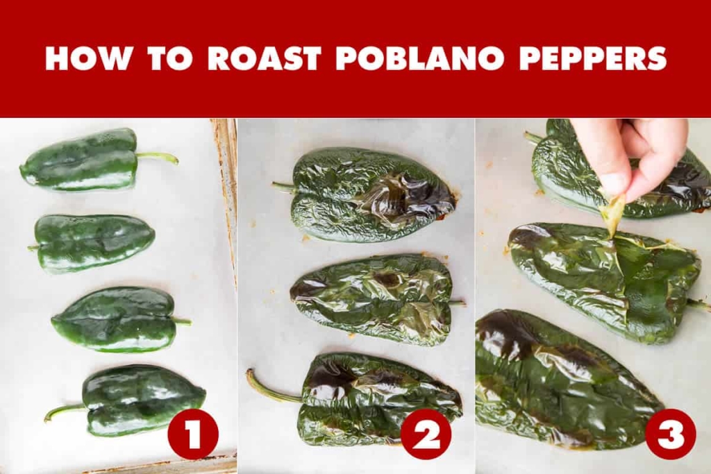 First, roast the poblano peppers. Set your oven to broil. Set the poblano peppers onto a lightly oiled baking sheet. Broil them for 10-15 minutes, or until the skins puff up and char and loosen from the pepper flesh. Flip them halfway through the process to get both sides. Remove them from the oven and cool slightly. Peel off the skins, rough chop then set them aside.