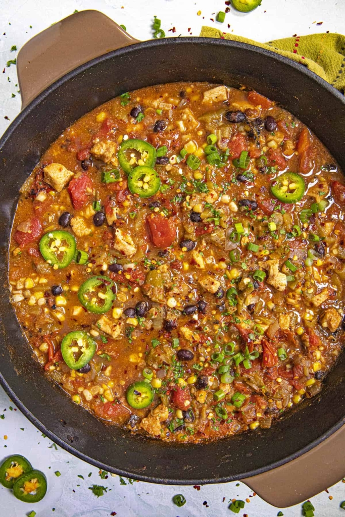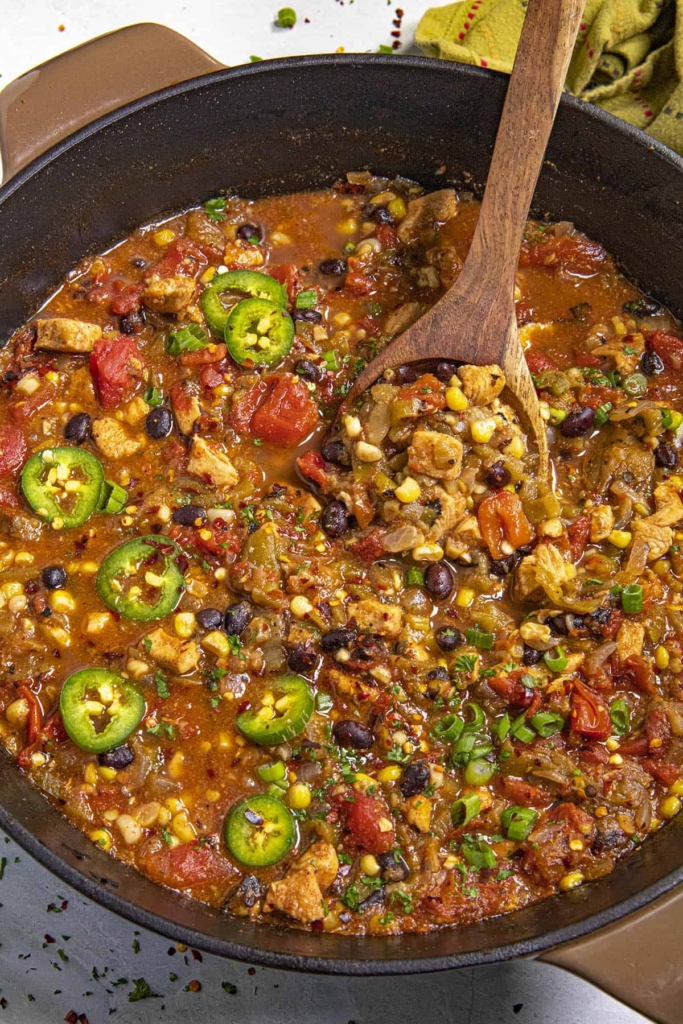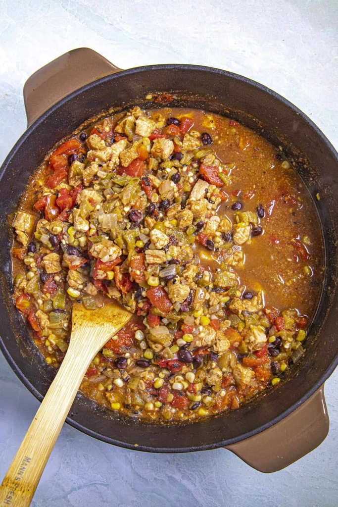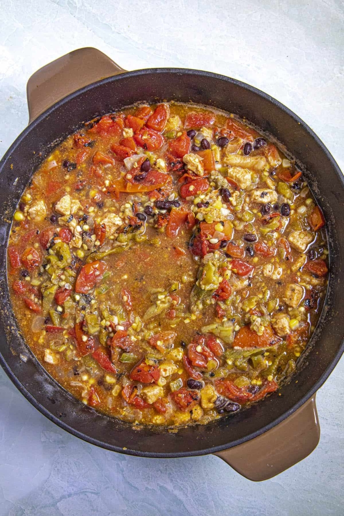 Stir in the roasted poblano peppers, fire roasted tomatoes, black beans, corn, chicken broth, and chopped chicken.