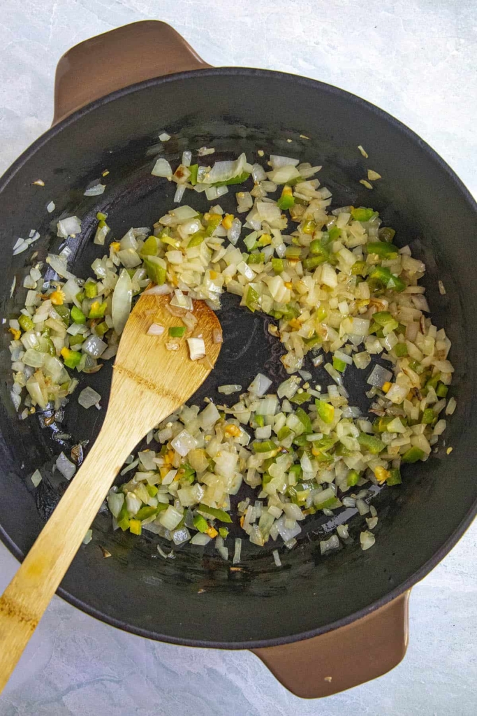 Next, heat the oil in a large pot. Add the onion and jalapeno pepper. Cook them down for 5 minutes to soften.
