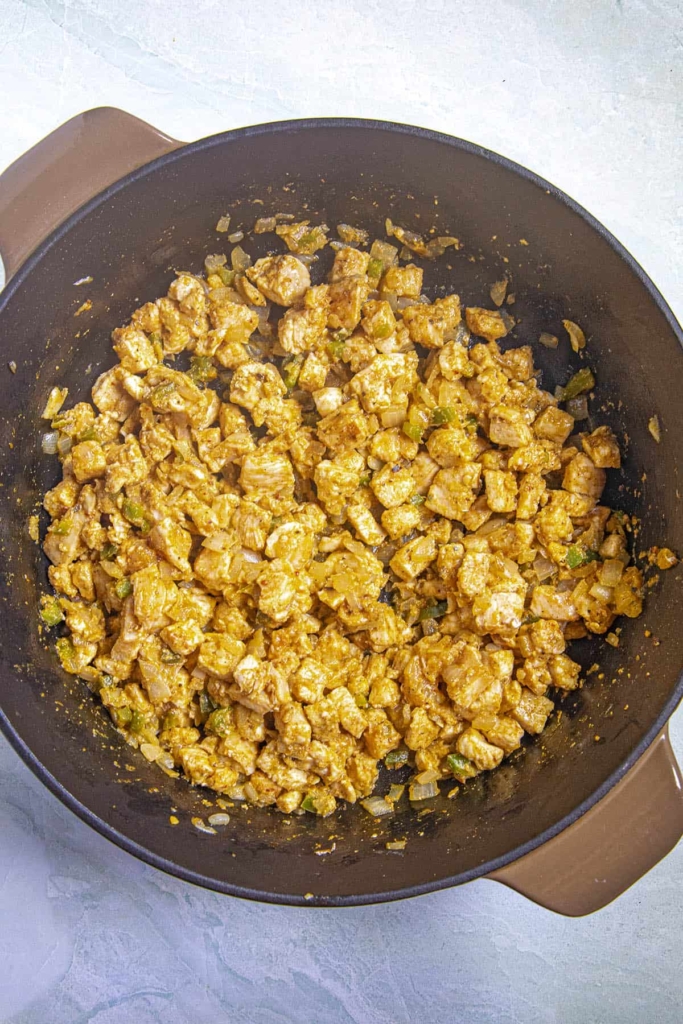 Rough chop the chicken so it is nice and chunky. Season it with 1/2 tablespoon southwest seasoning blend, then cook the chicken in the pot, stirring, until it is mostly cooked through, 5-6 minutes.