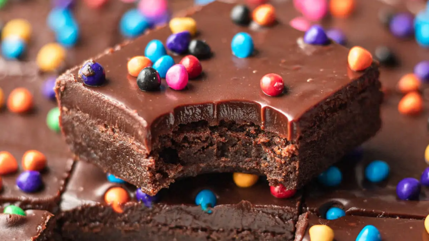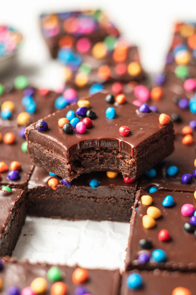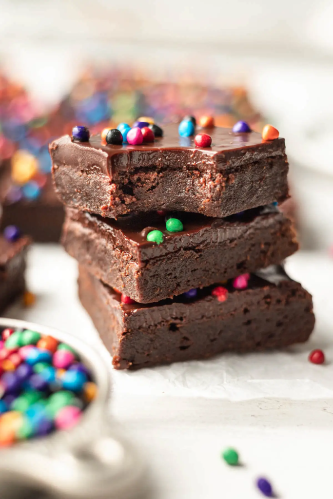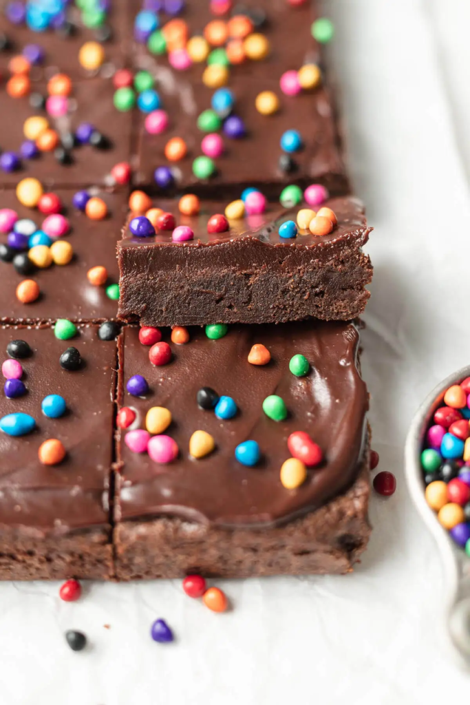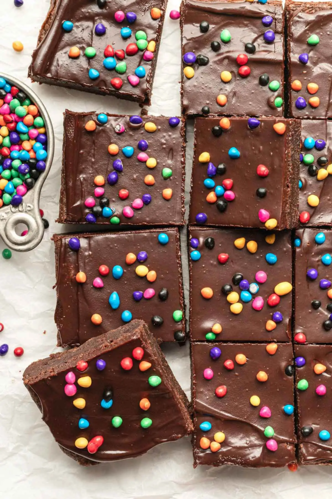 To make the ganache: Place the chopped chocolate and corn syrup into a large heatproof bowl. Set aside. Heat the heavy cream in a medium pot and bring to a simmer on the stove (or heat in the microwave for 45 seconds to 1 minute). Pour the simmering cream over the chocolate and let it sit for 3 minutes. Mix with a rubber spatula or spoon until the mixture is smooth and well combined. If any chocolate clumps remain, microwave in 20 to 30-second increments until melted and smooth. Use a spatula or spoon to spread the chocolate ganache over the cooled brownies. Sprinkle with rainbow candy coated chocolate chips, mini M&Ms, or sprinkles. Refrigerate for 1 to 2 hours to allow the ganache to set before serving. Cut into squares when ready to serve!