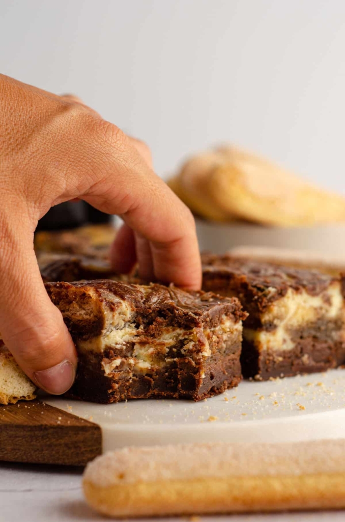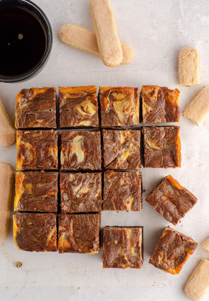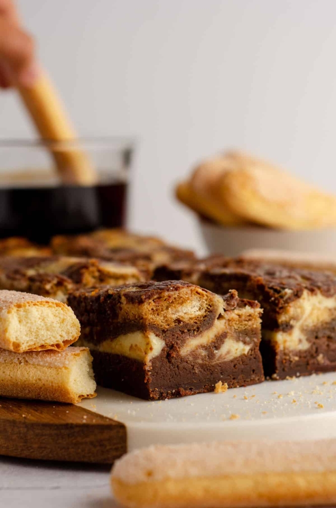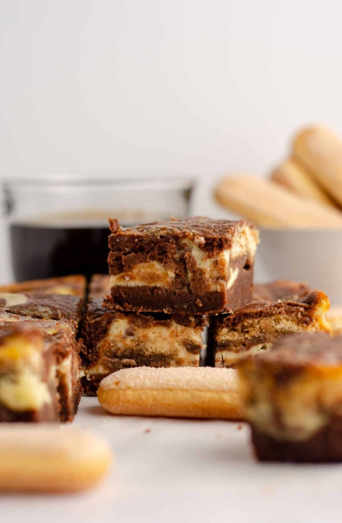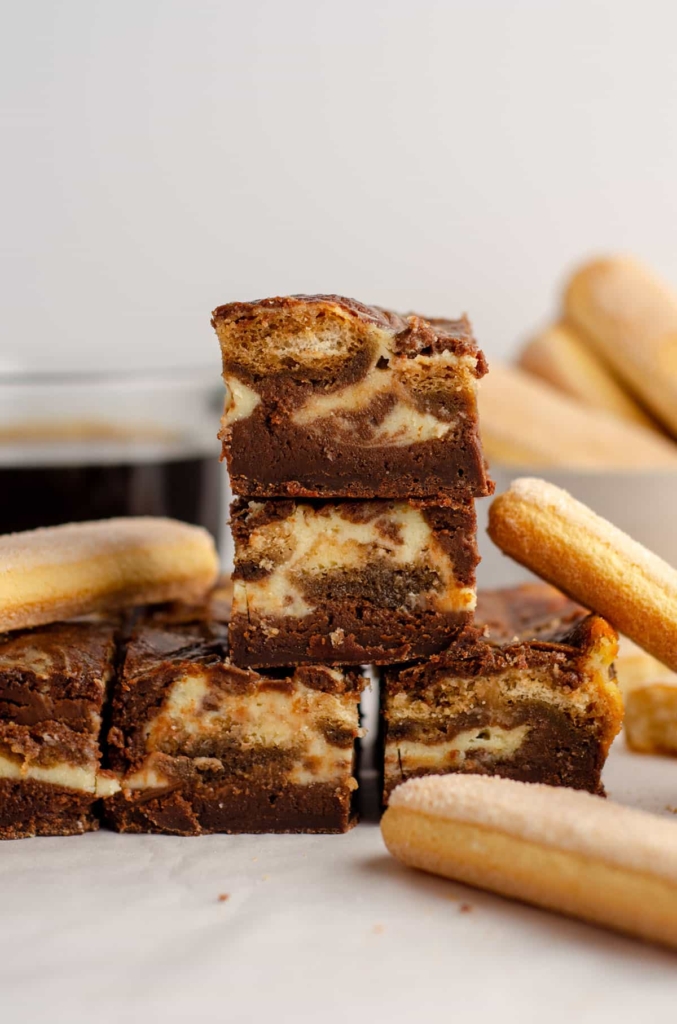 These tiramisu brownies are made with a scratch brownie base, a middle layer of coffee-soaked Ladyfingers, and a top layer of sweetened mascarpone cheese.