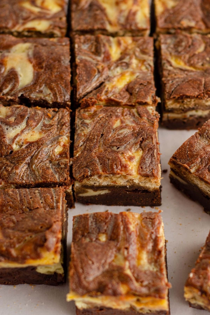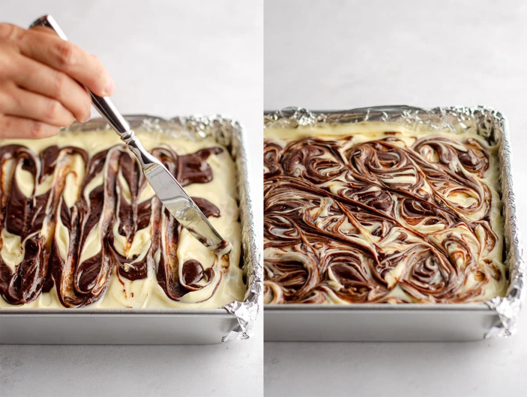 Drop spoonfuls of the reserved brownie batter on top of the mascarpone cheese layer and use a knife to create swirls by dragging it through the batter.