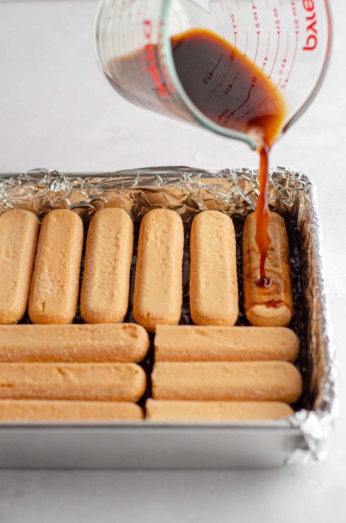 Once you have placed all 12 Ladyfinger cookies, pour the brewed coffee evenly over the Ladyfingers.