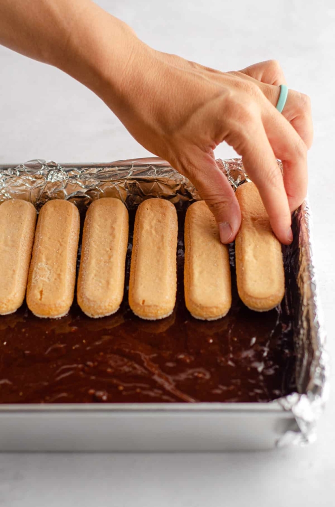 Press each individual Ladyfinger cookie upside down into the brownie batter. See post narrative for a visual.