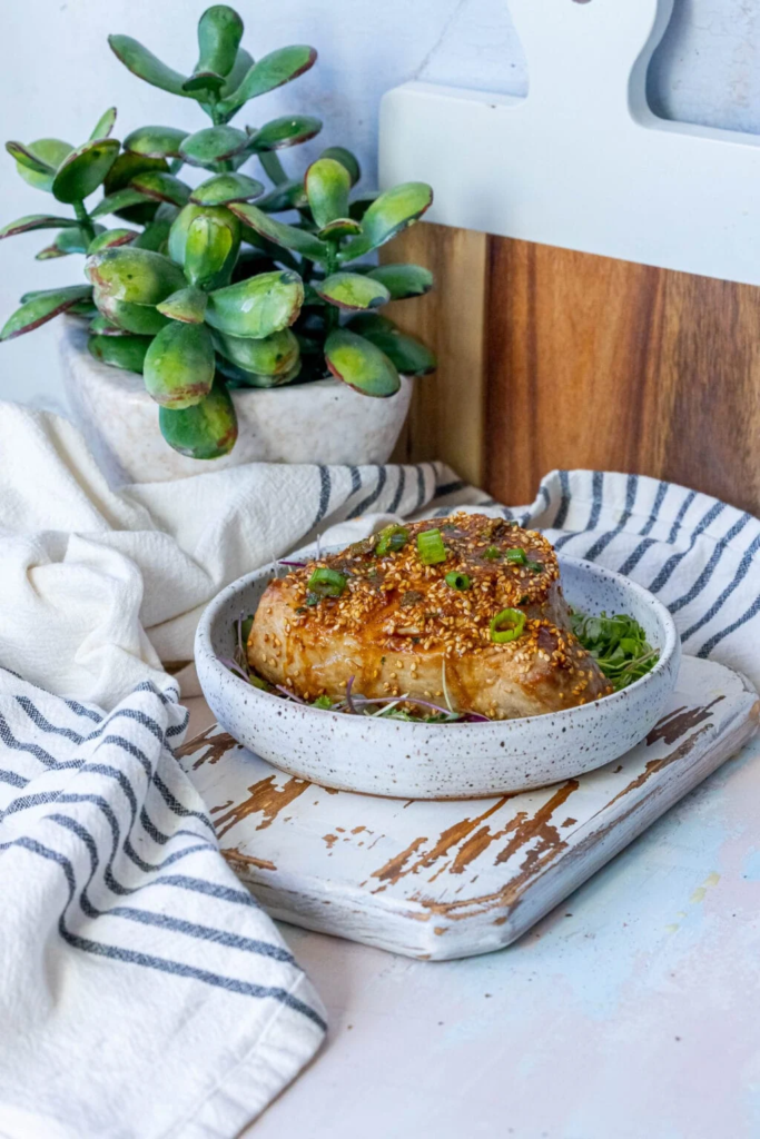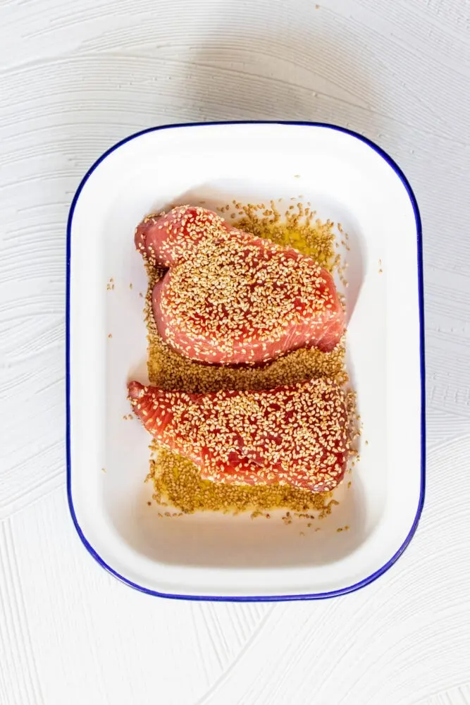 Preheat grill to medium-high (350 degrees F) In a small bowl, mix olive oil, sesame oil, ginger, soy sauce, garlic powder, rice vinegar, and half sesame seeds. Pour half sauce over tuna steaks, and reserve half for finishing tuna. Let fish marinate, refrigerated, for at least 20 minutes (as grill comes to temperature) up to overnight. When grill is scorching hot, remove tuna steaks from the marinade and discard excess the marinade fish was sitting in. Cover fish with 1 tablespoon of sesame seeds to make a “crust” before grilling. Add more than 1 tablespoon if needed. Place steaks on grill. Grill 2-3 minutes per side, drizzling a bit of reserved sauce on top of fish as it cooks, until fish is charred on each side. For medium-rare tuna steaks, cook to 135 degrees F. The FDA recommends 145 degrees F.Remove tuna from grill, and top with reserved sauce, green onions, and additional sesame seeds. Enjoy!