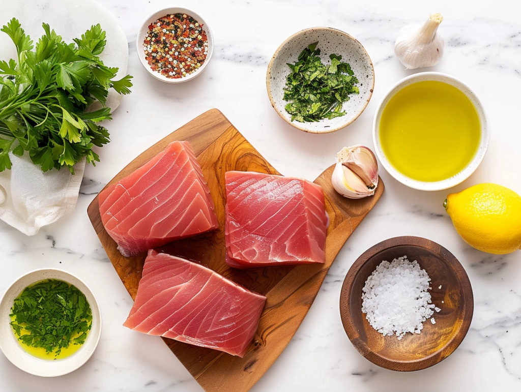 Preheat your grill to high heat, approximately 400°F (204°C). In a small bowl, whisk together olive oil, lemon juice, minced garlic, chopped parsley, oregano, salt, black pepper, and red pepper flakes (if using) to create the marinade. Place the tuna steaks in a shallow dish and pour the marinade over them, ensuring both sides are well-coated. Let the steaks marinate for 5 minutes. Once the grill is hot, oil the grill grates to prevent sticking. Place the marinated tuna steaks on the grill. Grill the tuna steaks for about 3 minutes on each side for medium-rare, or longer if you prefer more well-done fish. Remove the tuna steaks from the grill and let them rest for a couple of minutes before serving.