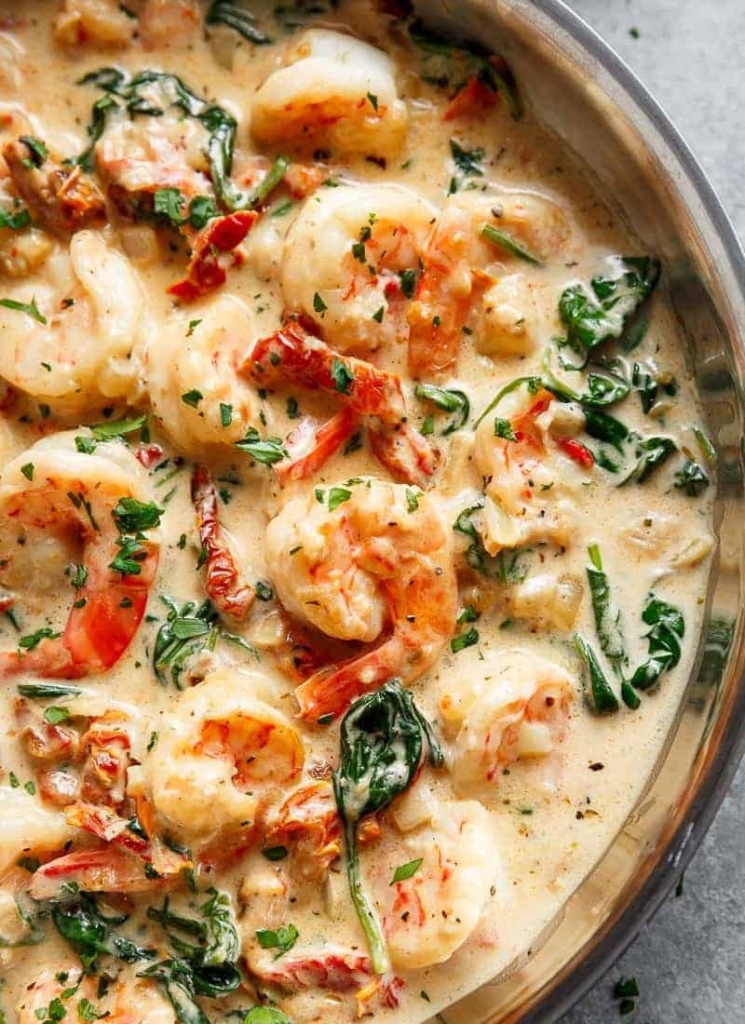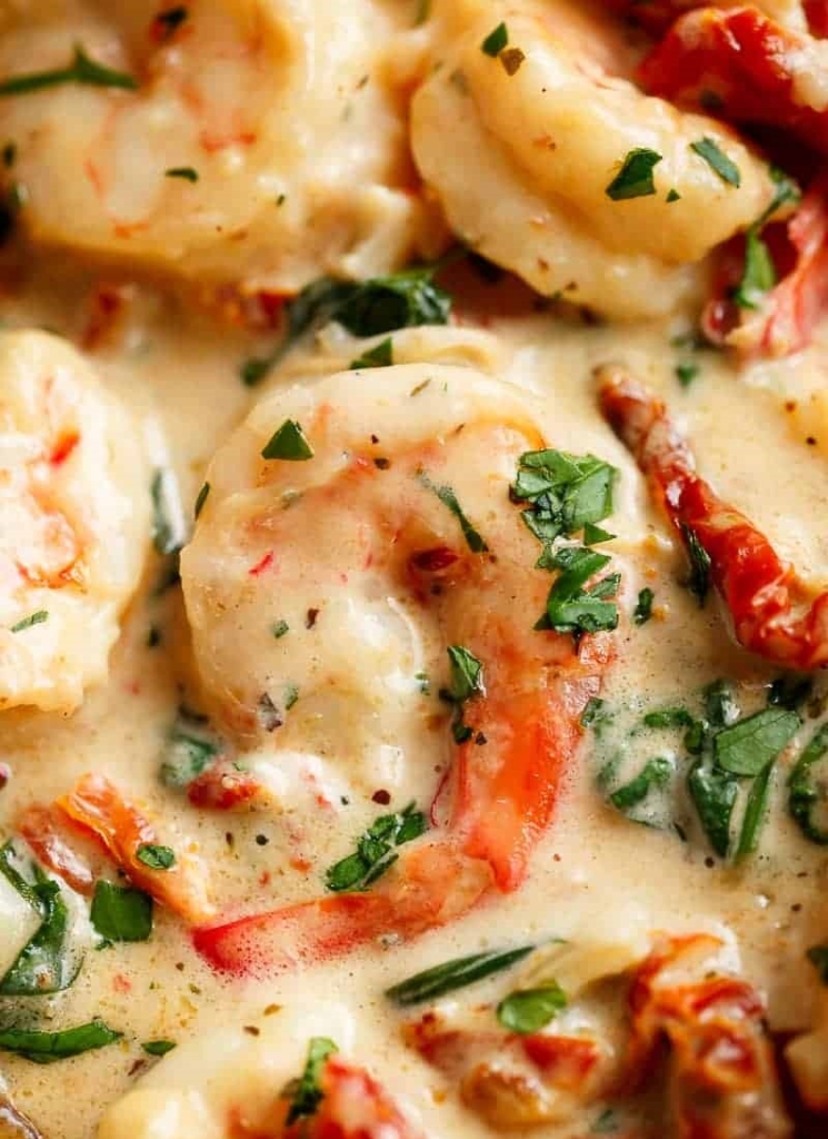 Tuscan Garlic Butter Shrimp coated in a light and creamy garlic parmesan sauce filled with sun dried tomatoes and spinach! Packed with incredible flavors! Guaranteed to impress!