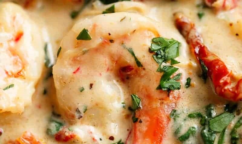 Heat a large skillet over medium-high heat. Melt the butter and add in the garlic and fry until fragrant (about one minute). Add in the shrimp and fry two minutes on each side, until just cooked through and pink. Transfer to a bowl; set aside. Fry the onion in the butter remaining in the skillet. Pour in the white wine (if using), and allow to reduce to half, while scraping any bits off of the bottom of the pan. Add the sun dried tomatoes and fry for 1-2 minutes to release their flavors. Reduce heat to low-medium heat, add the half and half and bring to a gentle simmer, while stirring occasionally. Season with salt and pepper to your taste. Add in the spinach leaves and allow to wilt in the sauce, and add in the parmesan cheese. Allow sauce to simmer for a further minute until cheese melts through the sauce. (For a thicker sauce, add the milk/cornstarch mixture to the center of the pan, and continue to simmer while quickly stirring the mixture through until the sauce thickens.) Add the shrimp back into the pan; sprinkle with the herbs and parsley, and stir through. Serve over pasta, rice or steamed veg.