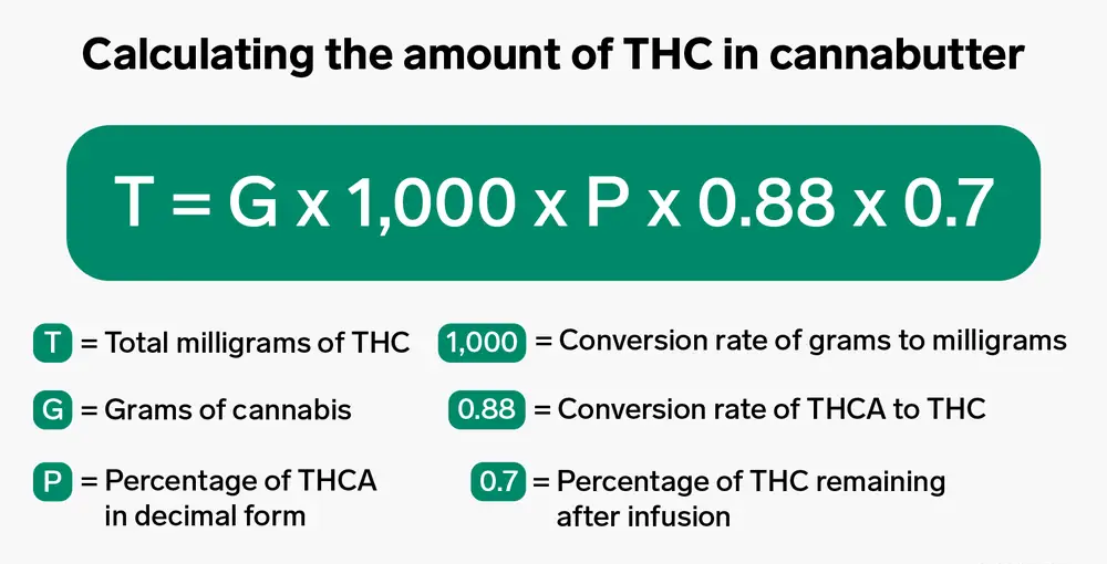 Dosing homemade edibles is a complex but necessary part of the process. Each batch varies, depending on your type of cannabis and cooking techniques. All you need to know is how much cannabis you used in your butter and its THCA percentage. In most legal markets, the THCA percentage is listed on the lab report printed on every jar of cannabis, so it should be easy to find. Here is an approximate equation that will help you estimate the dosage. This leaves you with a very rough estimate of the potency of your butter and can serve as a guide for dosing. But remember that there will always be variables that affect how much THC ends up in your final product. Take these numbers with a grain of salt and always be careful when taking edibles.