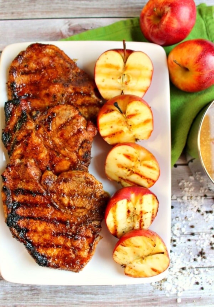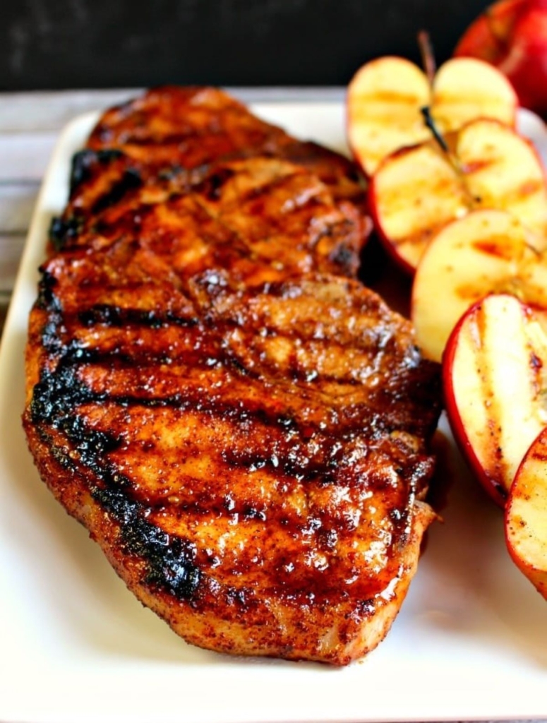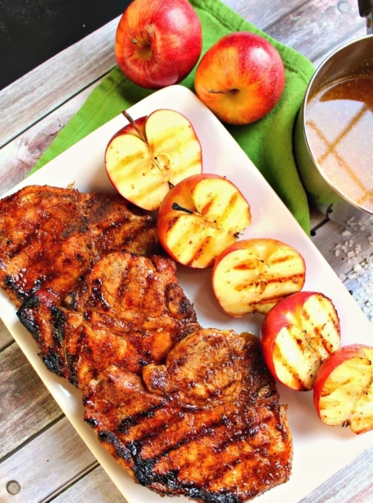 Light your gas or charcoal grill and heat to medium high heat. In a small saucepan, prepare the glaze by combining the apple cider, maple syrup, Dijon mustard, crushed red pepper flakes, and salt. Bring to a simmer. While the cider comes to a simmer, prepare the pork rub. In a small bowl combine the brown sugar, chili powder, garlic powder, salt and pepper. Mix thoroughly with a fork. Add the oil to the spice mixture. It will be the consistency of a crumbly paste. Pat the pork chops dry with paper towels, and then cover the chops on all sides with the spice rub. Put the spice covered pork chops on the heated grill, and thoroughly brush with the cider glaze. Grill for about 6 minutes. Flip the chops and thoroughly brush with the glaze on the other side. Grill for about 2 more minutes, flip and brush again. Repeat this process until the chops cook for 10-12 minutes total, and reach an internal temperature of 145 degrees. Its okay for pork to have a little pink in the middle. If you’re also grilling apples, brush the halved apples with glaze and grill for about 5-6 minutes. No need to flip. Serve along with the chops.