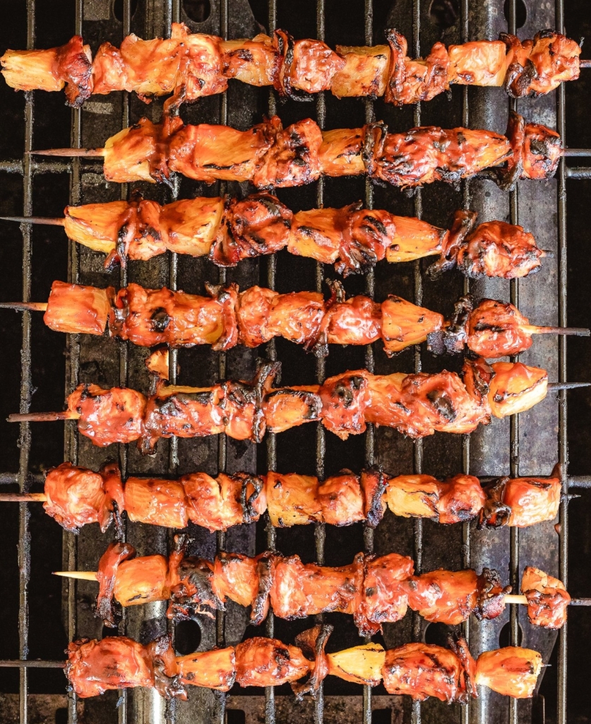 Combine chicken pieces with 1 cup of the BBQ sauce and marinate for 2-3 hours. (This step can be omitted if you’re pressed for time!) Using wooden skewers previously soaked in water for at least 1 hour (or metal skewers!) thread chicken, bacon pieces and pineapple in a pattern. The larger pieces of pineapple are easier to skewer. Fold thin bacon pieces over in half and arrange next to the chicken, being careful to not put the bacon pieces too close to anything else, so that they have space to heat up properly to cook.