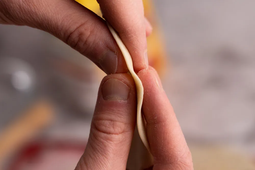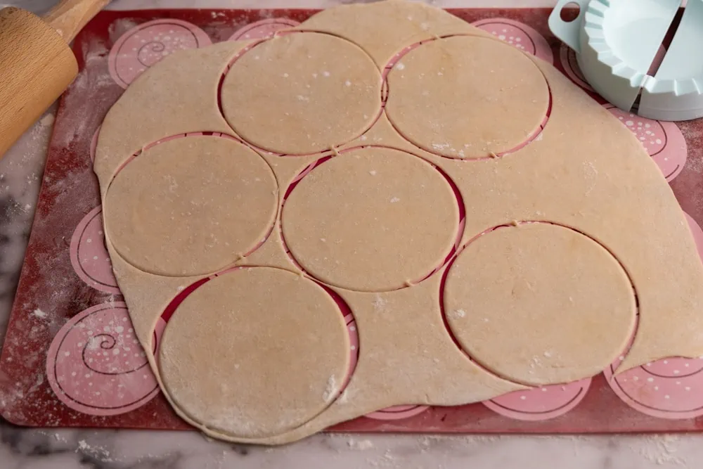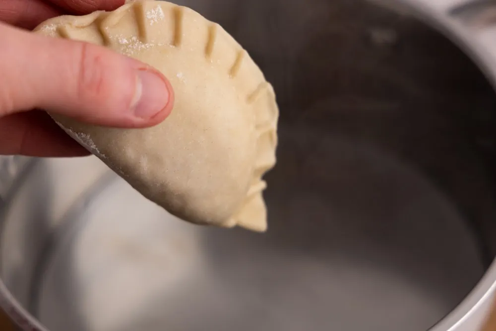 – Make sure to have a small bowl of water nearby when forming the pierogi. That water will allow you to quickly moisten the outer edge of the dough, helping it stick better.