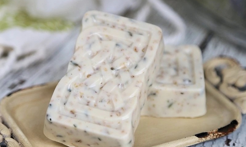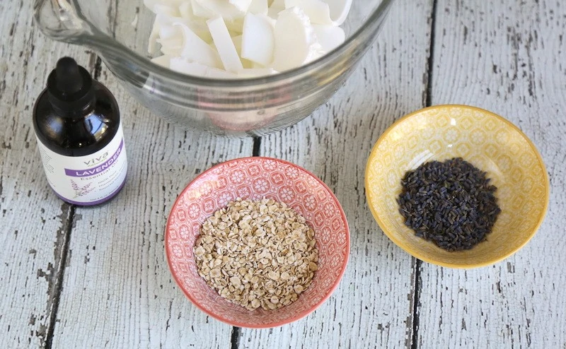 Chop the melt and pour soap into chunks and add the oats and lavender. Microwave until melted. This should only take slightly over a minute. Add the lavender essential oil and mix well, then pour into soap molds. Allow to fully cool until hard before popping out of the molds. Chilling the soap bars in the refrigerator is fine, but do not freeze.