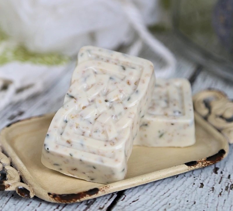 Easy lavender oatmeal soap recipe using melt and pour soap base. A great homemade lavender soap recipe for beginners and easy gift idea. I enjoy making this soothing lavender oatmeal soap recipe. It is super quick and easy, yet the results are clearly a handcrafted soap.  The use of a natural grain and lavender flowers makes it quite evident that this soap is homemade.  I think that is especially nice when making gifts. The soap makes a wonderful Mother’s Day, birthday or thank you gift and only takes a few minutes to make a batch. This is a simple melt and pour soap so is ready as soon as it cools making it a wonderful last minute DIY gift idea.