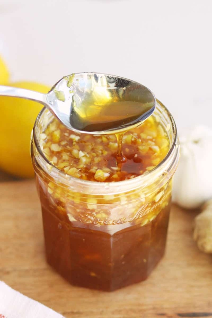 Add the chopped garlic, minced ginger, lemon zest and juice in a jar. Fill the rest of the way with honey.