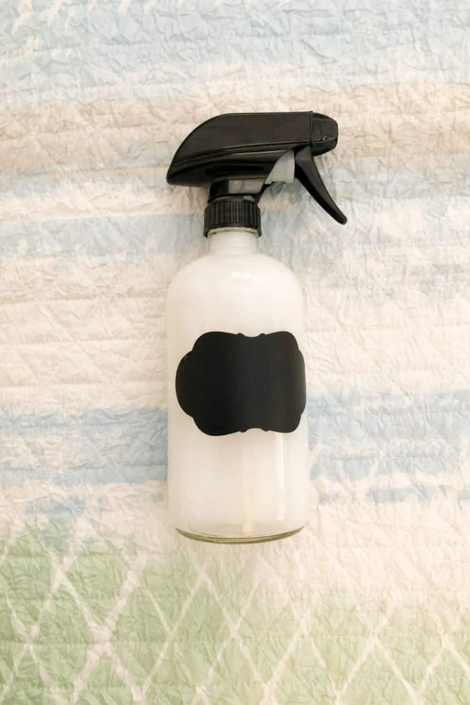 Fill your spray bottle with about 2 – 3 cups hot water. (Portions can be adjusted slightly, depending on the size of your spray bottle.)