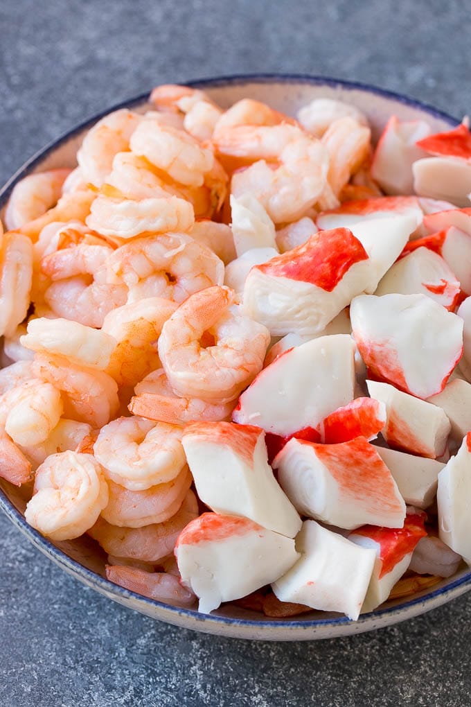 – You can use imitation crab flakes because they’re already cut into bite sized pieces. You can also buy the stick-style imitation crab and slice it yourself.
