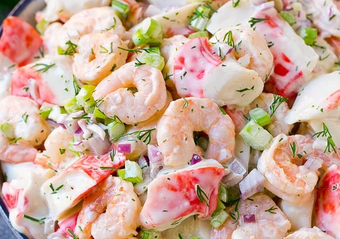 This seafood salad is a blend of imitation crab and shrimp in a creamy dill dressing with fresh vegetables. An easy high protein lunch option that takes just minutes to make! I love a good salad for lunch, I often whip up a quick sandwich, or this irresistible seafood salad. This salad can be served in so many different ways and it always gets rave reviews.