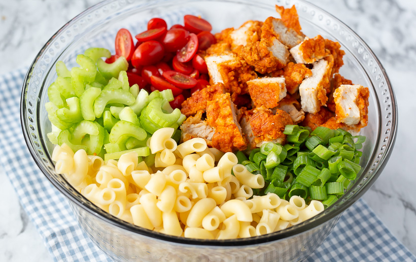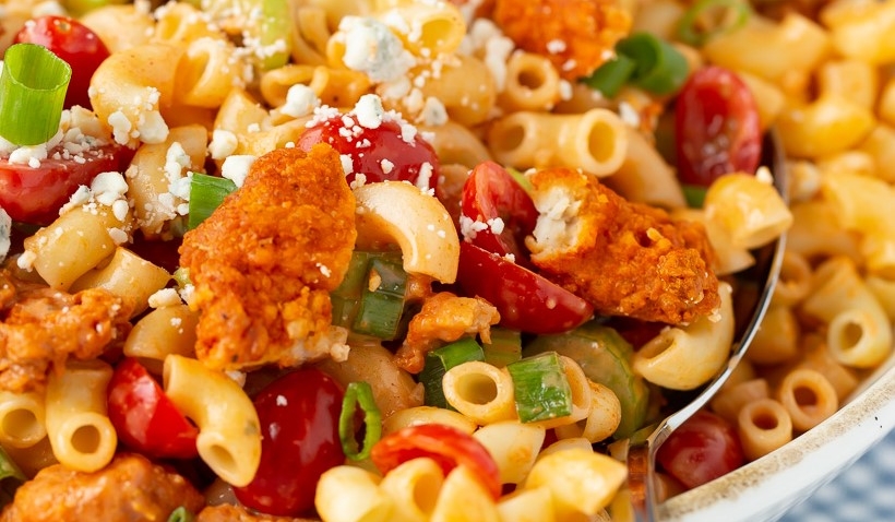 Summer is almost here! So bring on all the fun pasta salad recipes to take to potlucks and neighborhood parties! Let’s start off with this delicious Easy Buffalo Chicken Pasta Salad recipe. This is like a party in your mouth with an explosion of incredible flavor. If you’re looking for a special side dish to bring to your next party, this is it! And if you have boys or a husband that loves buffalo as much as mine, they are going to be obsessed with this pasta salad.