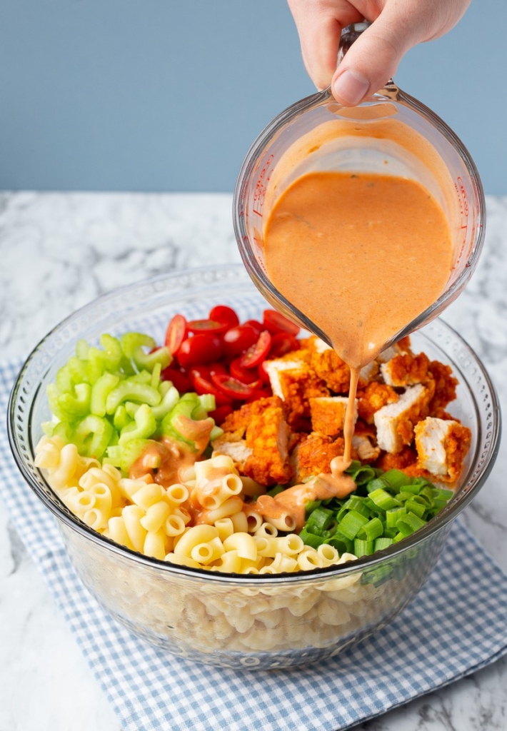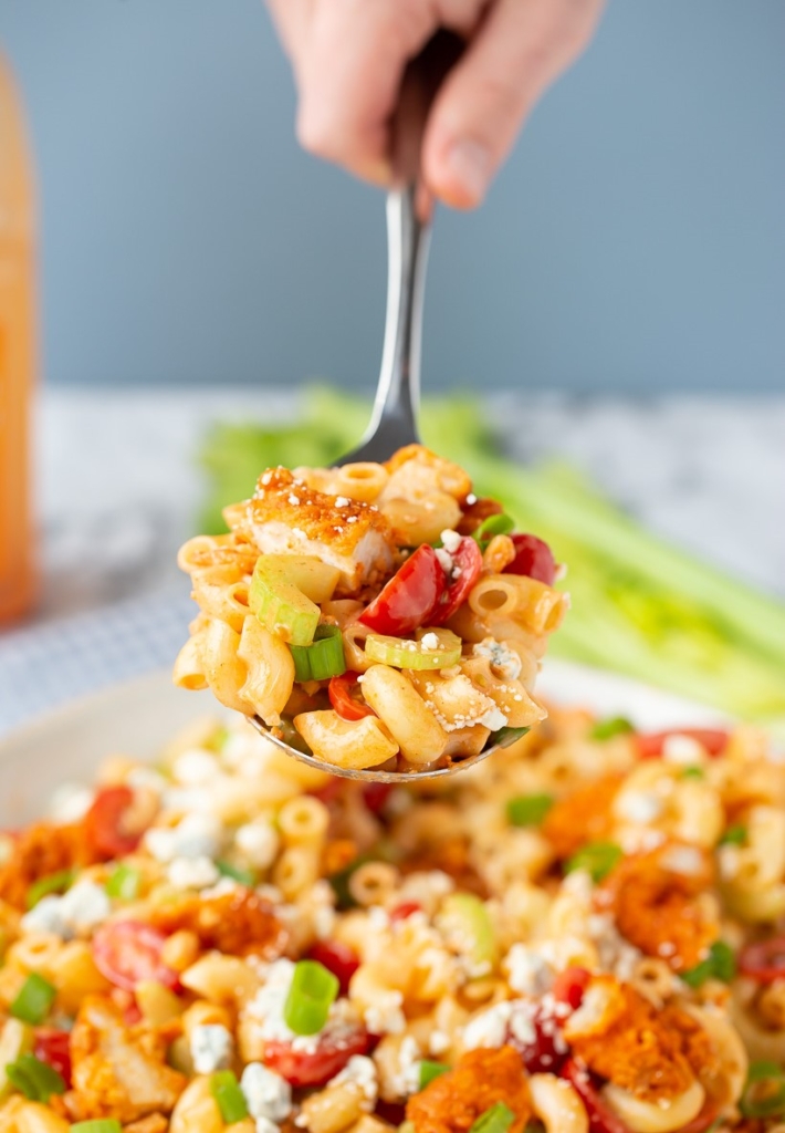 Once the pasta and chicken are cooled, add into a large bowl with celery, tomatoes and green onions. Whisk together buffalo sauce and ranch dressing in a small bowl and pour half into the pasta, stir and then taste. Continue to add dressing until you like the flavor! (Adults may like more of a kick and kids may prefer a more mild flavor.) Refrigerate for at least one hour until the pasta salad is cold. Crumble over the blue cheese and serve.