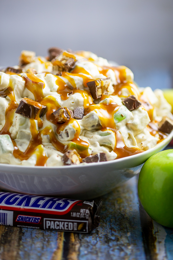 Snickers Caramel Apple Salad is actually a creamy, sweet dessert with bits of crisp, tart apples and gooey candy bar pieces. Snickers Caramel Apple Salad is one of those desserts that’s no-so-cleverly disguised as a salad. Or maybe it’s the other way around… Whatever it is, it’s sweet and tart, crunchy and gooey, creamy and cool, and mostly just little bites of heaven. Or big bites. Can’t go wrong either way on that! Snickers Caramel Apple Salad is a great dish to bring to a potluck or gathering. It’s made with apples, pudding, Cool Whip, Snickers, and caramel sauce (like you put on ice cream!). It’s best served the day that it’s made, but it will keep well enough that you can make it the night before if you need to.