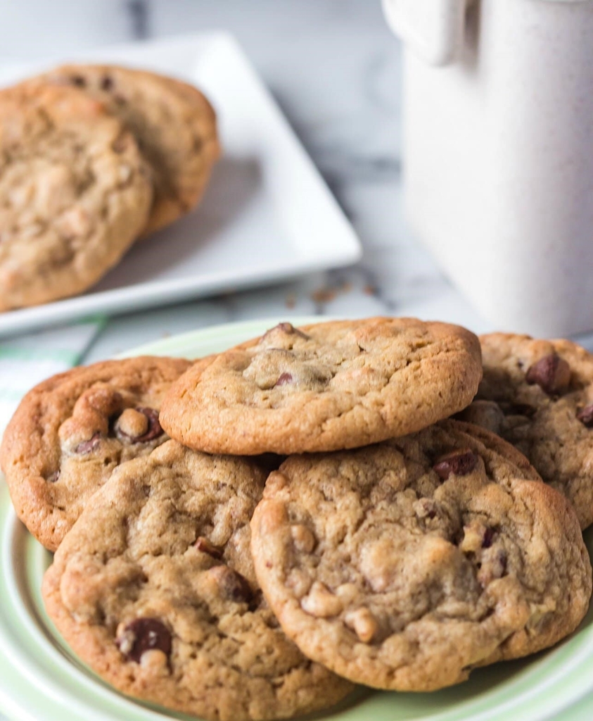 These Cappuccino Chocolate Chip Cookies are soft and chewy cookies that are busting with chocolate and cappuccino flavor. These cookies will be such a treat while enjoying your coffee. Perfect for an easy dessert, ice cream cookie sandwiches or for a twist on classic chocolate chip cookies for a bake sale. These cappuccino chocolate chip cookies are soft cookies that have a delicious mocha flavor. These cookies are sure to become a favorite. The coffee flavor mixed with the chocolate chips and bits of toffee makes these cookies a one of a kind favorite.