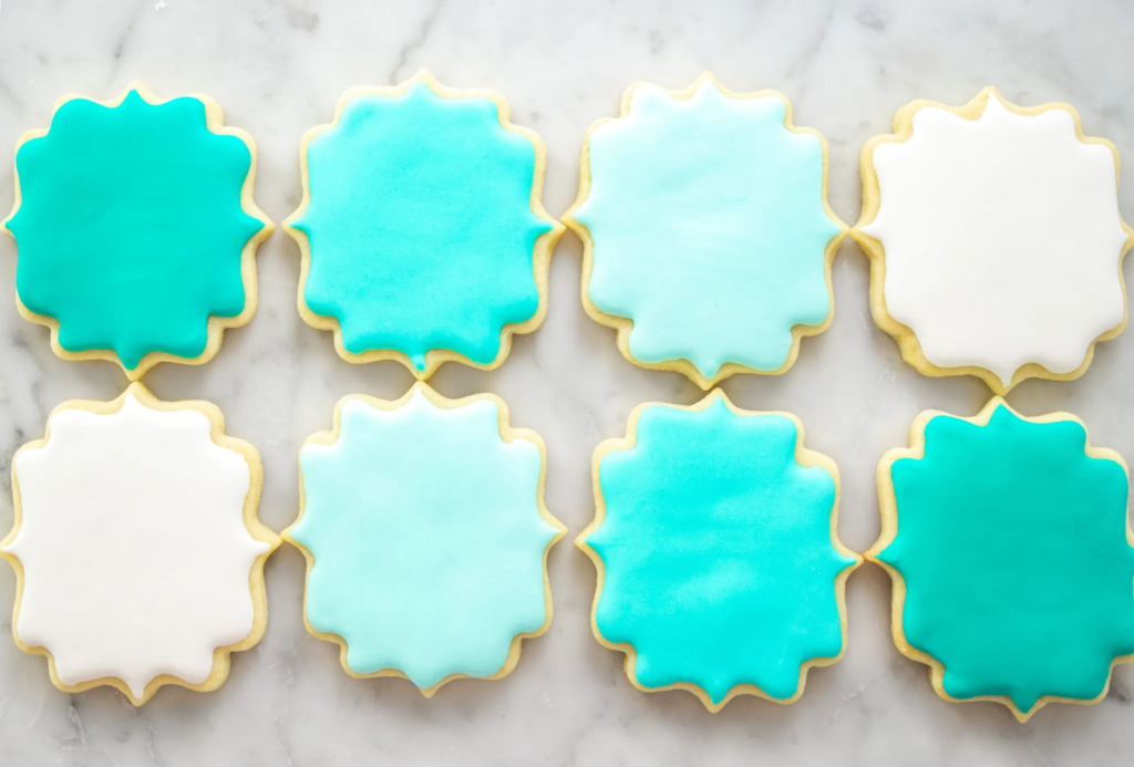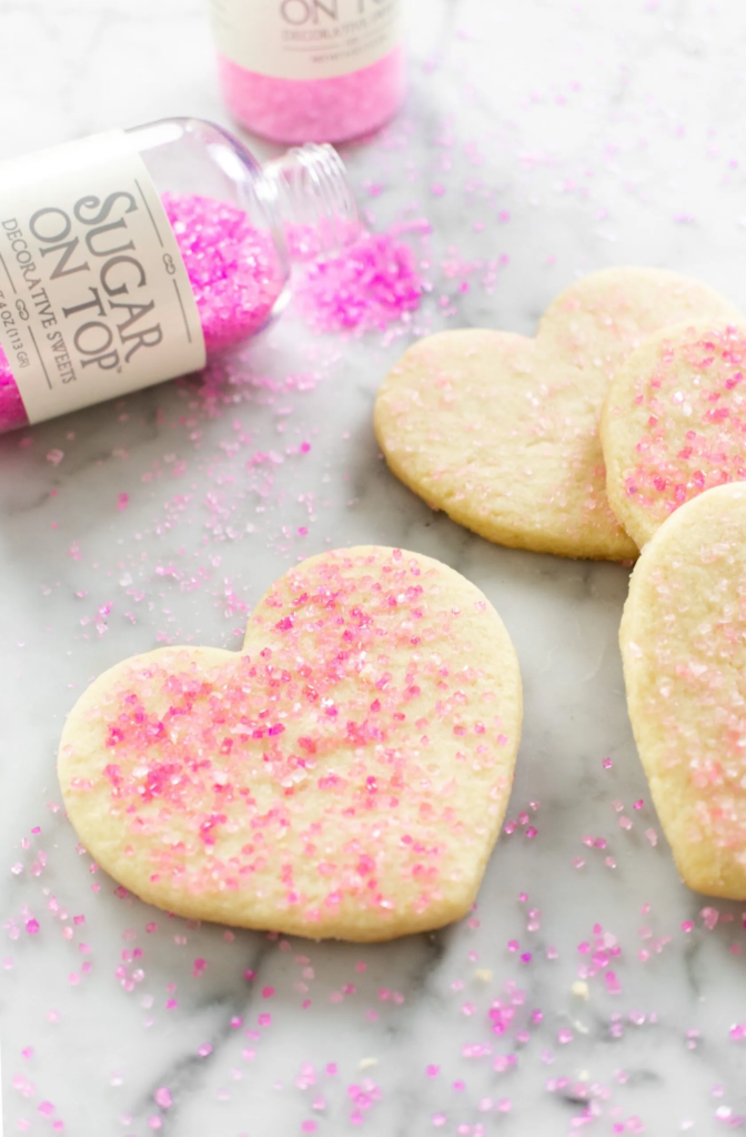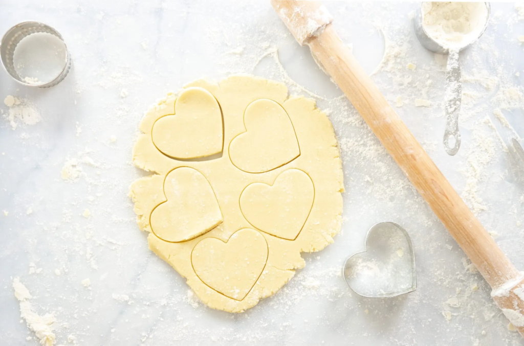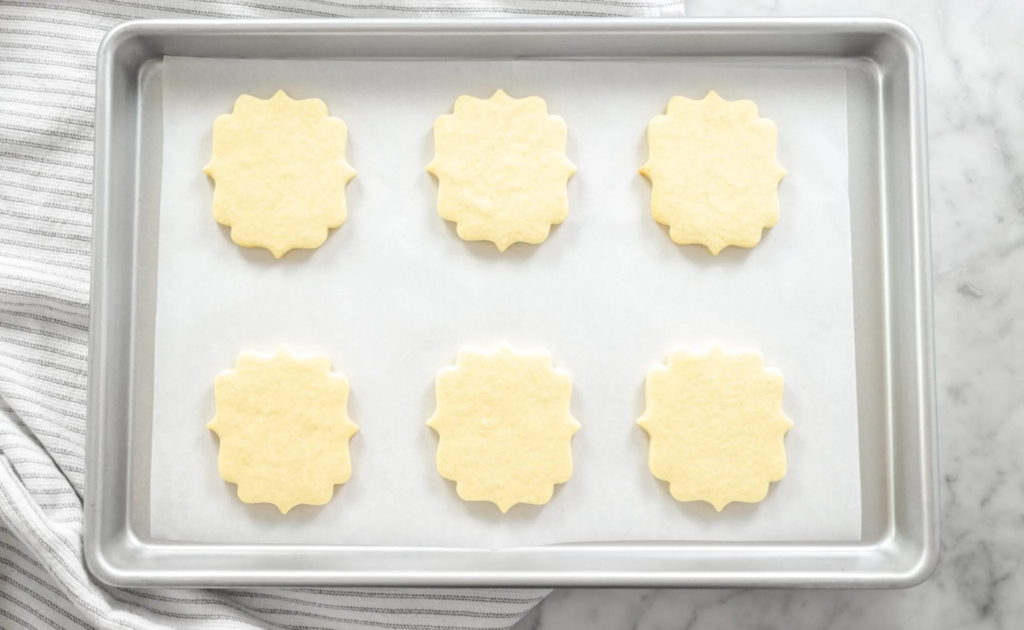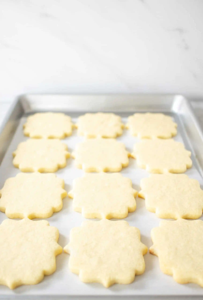 Roll to a ¼ inch thickness. Cut using your desired cookie cutters. Use an offset spatula to lift the cookies off the surface and place the cookies on the prepared tray. If you are decorating with sprinkles, this is when you would sprinkle your cookies.