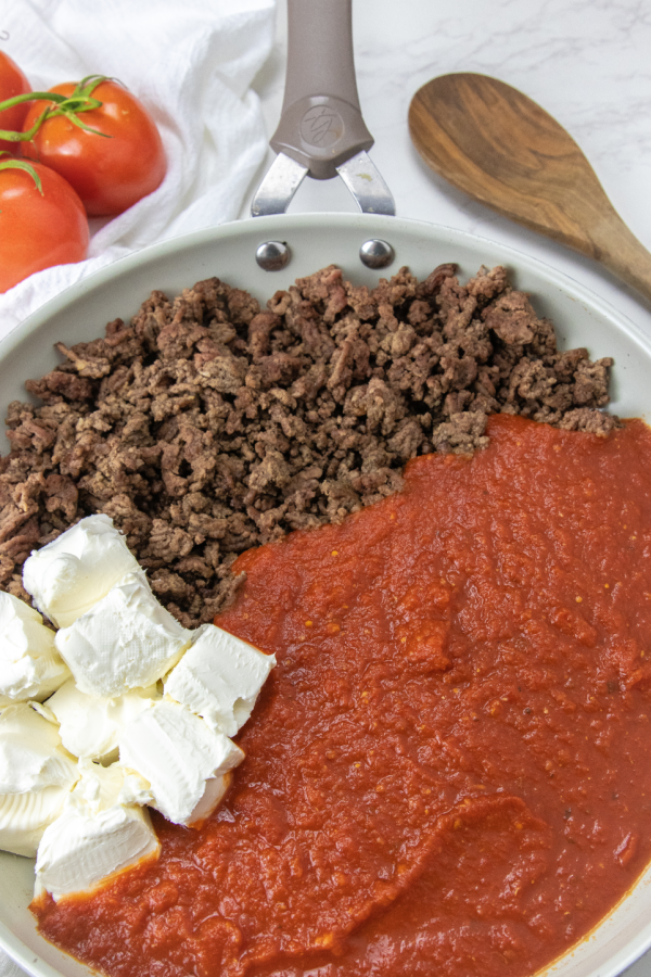 Boil the pasta a la dente according to the package instructions. We cooked ours for 10 minutes, but your amount of time might differ depending on the size and brand of your tortellini. Preheat your oven to 350 degrees and grease a 9×13 baking dish with baking spray. In a large skillet, brown the ground beef with the pepper, garlic salt, and parsley. Remove the excess grease from the browned beef and then stir in your tomato sauce and cream cheese. Simmer for a few minutes until the sauce is thoroughly mixed, Add parmesan cheese and mix. Combine the cooked tortellini with the sauce mixture and then pour it all into the casserole dish; Sprinkle with shredded mozzarella. Bake uncovered in the center rack of the oven for 15 minutes. Switch the oven to broil and continue baking for an additional 3-4 minutes or until the cheese starts to turn golden and bubbly. Serve with garlic bread and salad, if desired.