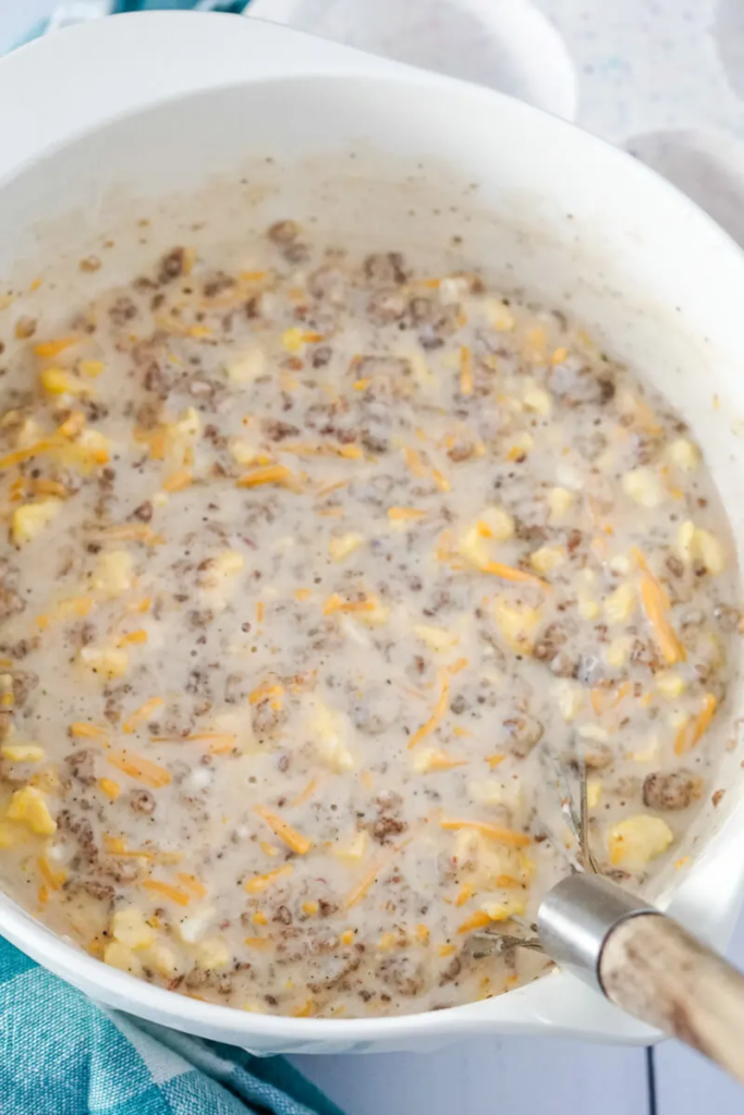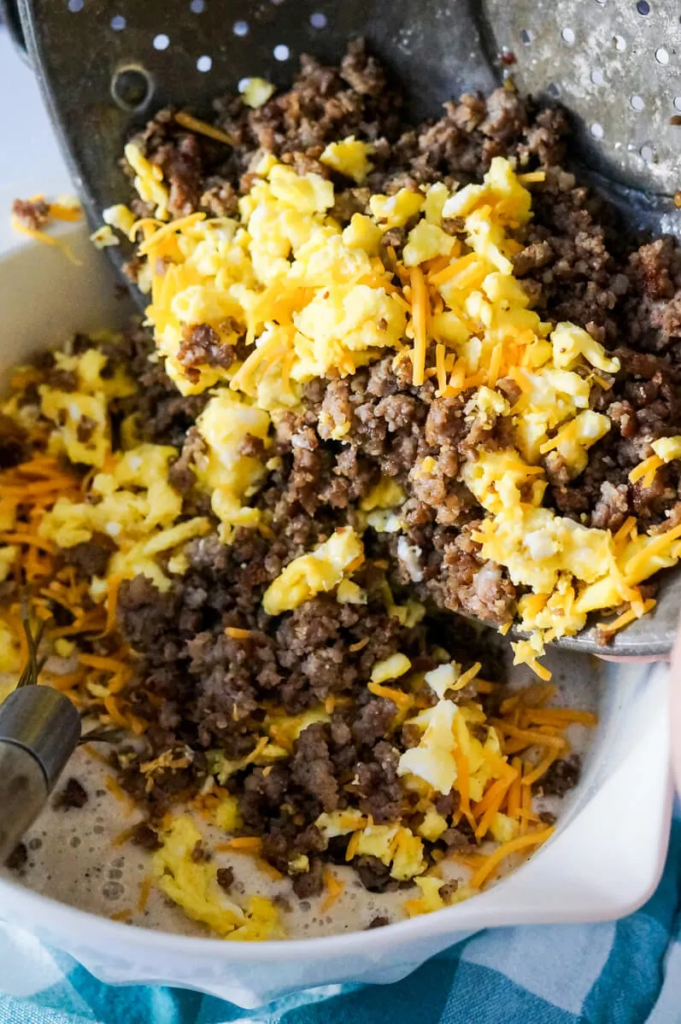 In a skillet, brown the breakfast sausage. Drain the grease from the meat and set it aside. Leave just enough grease in the bottom of the pan to scramble the eggs.