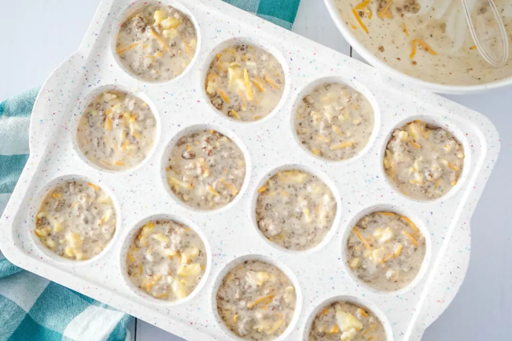 Pour the mixture by scant 1/4 cups into your prepared muffin pan.