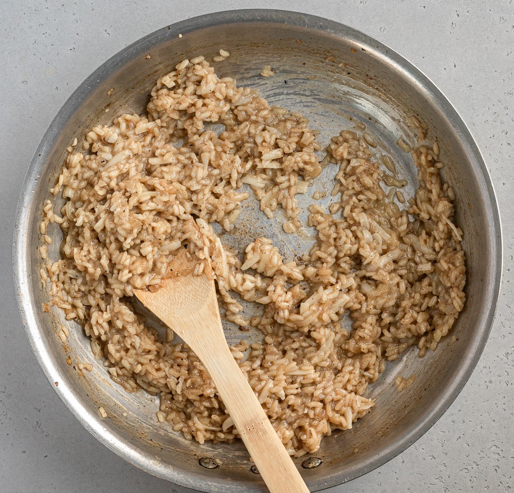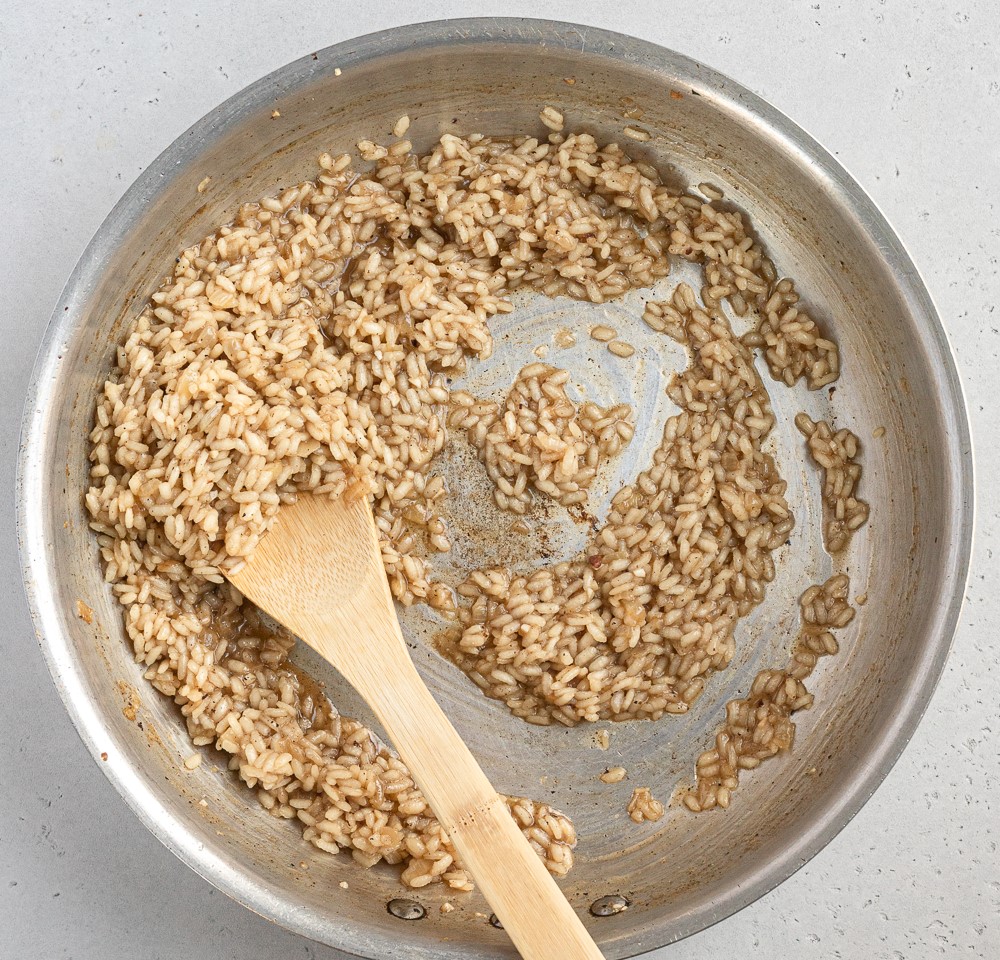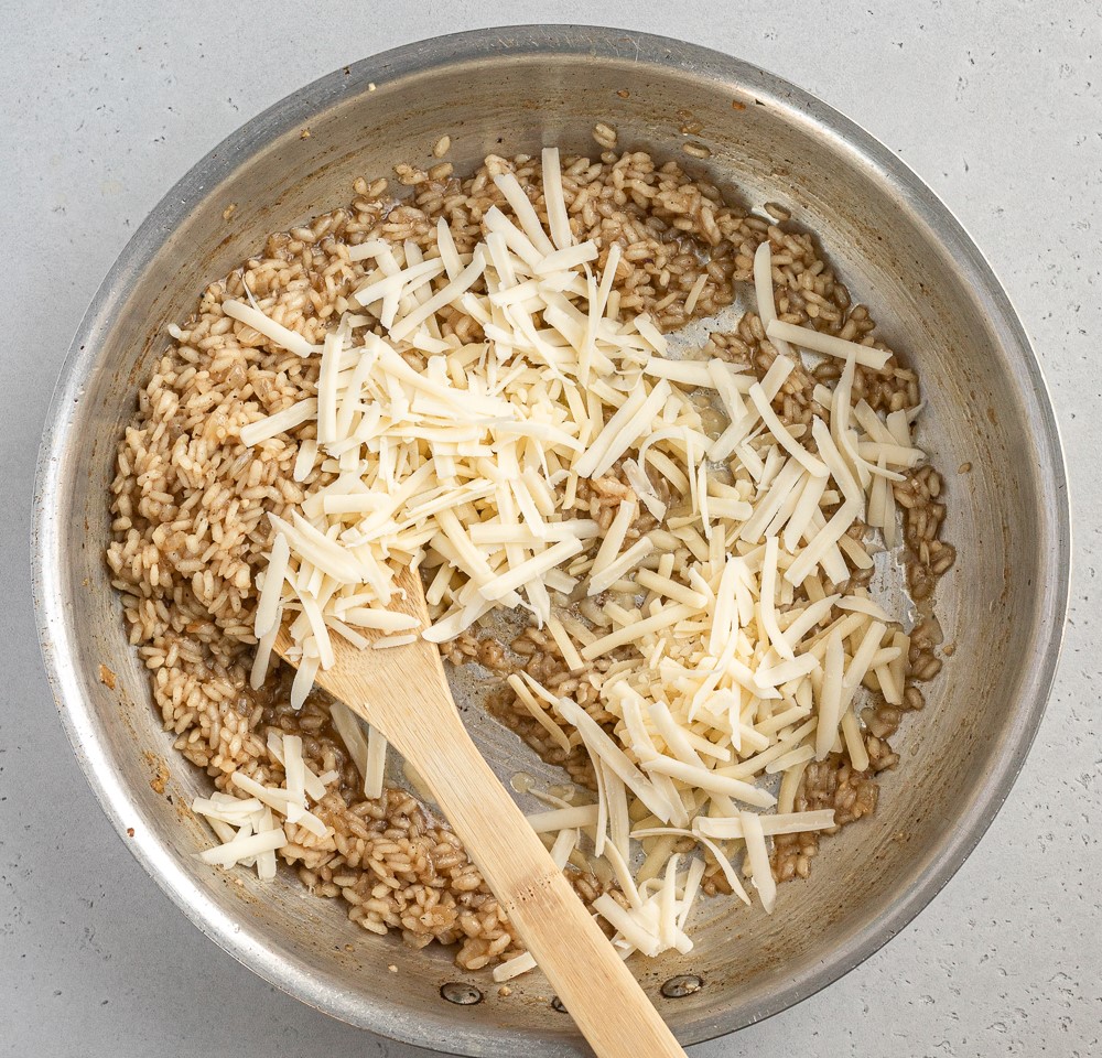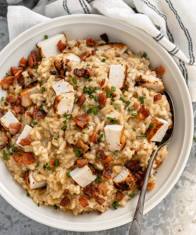 – I recommend seasoning a chicken breast with salt, pepper, and garlic powder before grilling it. Ideally, grill it while you’re making the risotto, let it rest for at least 10 minutes, then chop (or shred) and add to the risotto.