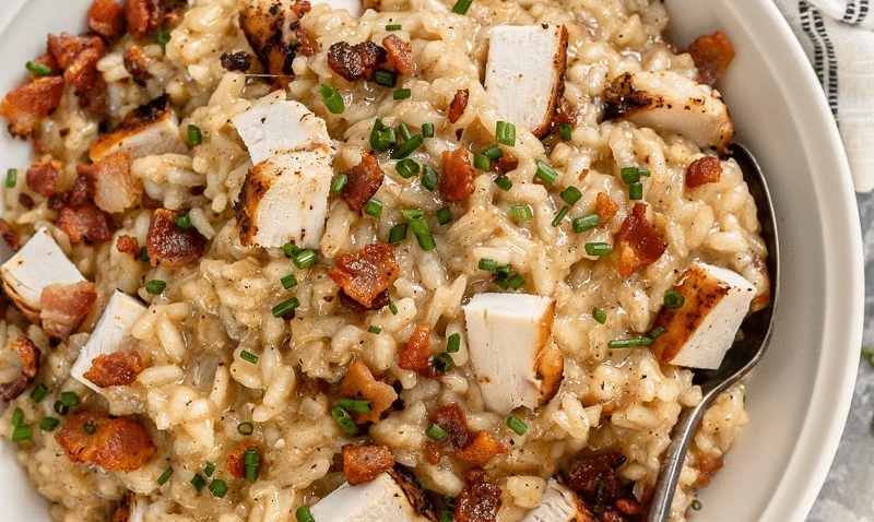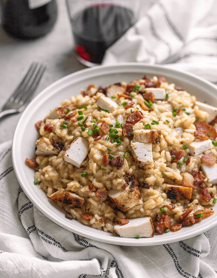 Stir in minced garlic, and cook for about one minute until it is very fragrant. Pour in the arborio rice, and stir to coat the rice in the onions, garlic, and fats. Allow the rice to cook for about two minutes, or until only a small white dot remains in the center of each rice grain. Stir in white wine, and cook for a minute or two as the alcohol burns off. Once the wine has been mostly absorbed into the rice, add the warm chicken stock one ladle at a time to the rice. As the rice absorbs the chicken stock, keep adding a ladle at a time. Stir quite frequently, almost a constant, smooth, stirring motion, to help the starches of the rice release, which creates the chewy texture of risotto. Continue this method until the rice develops a creamy, thick texture. Taste the rice as you go to make sure it isn’t too crunchy, and allow it plenty of time to become really creamy. This total process will take around 30-35 minutes for the rice to cook. Once the rice reaches al dente (still has just the slightest bite to it), add the cheese and bacon. Stir to melt in the cheese, and fully incorporate the bacon into the risotto. Stir in the chicken. Taste the risotto, and feel free to add more salt and pepper if you please. You can also add more cheese if desired. Serve on warmed plates, and garnish with finely chopped chives. Enjoy!