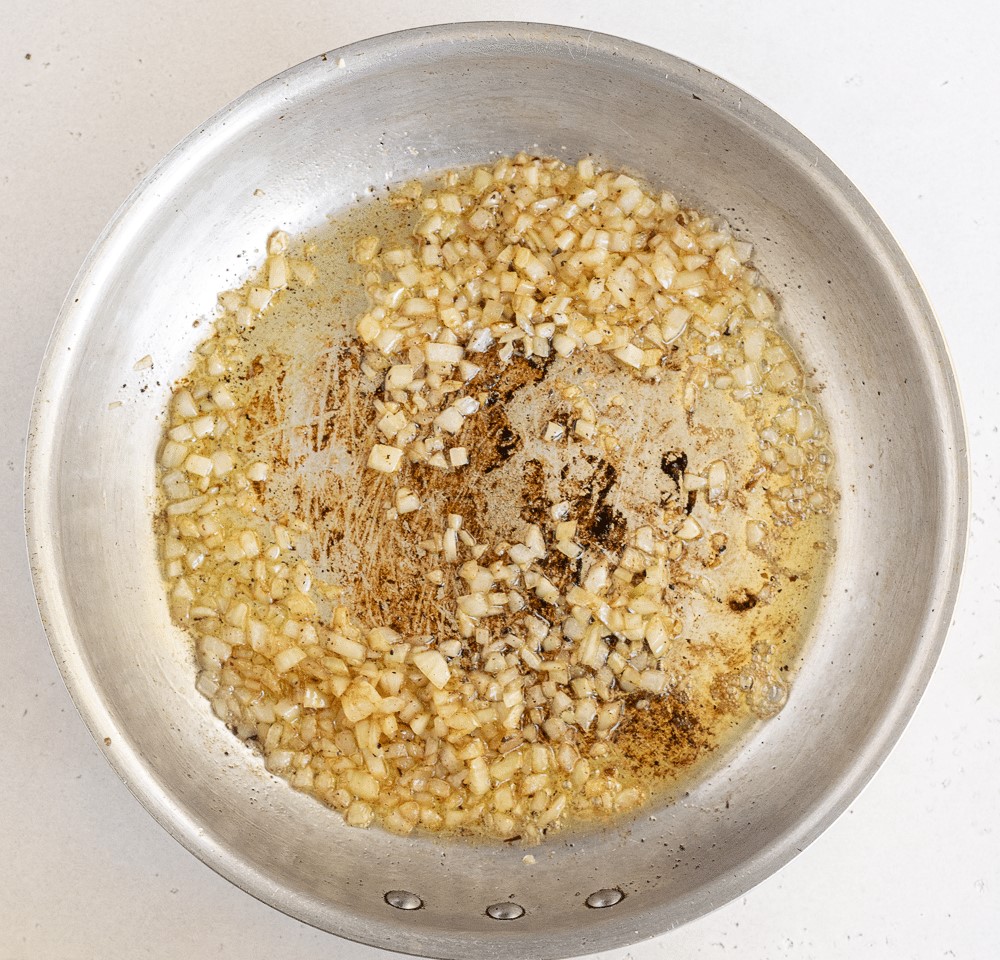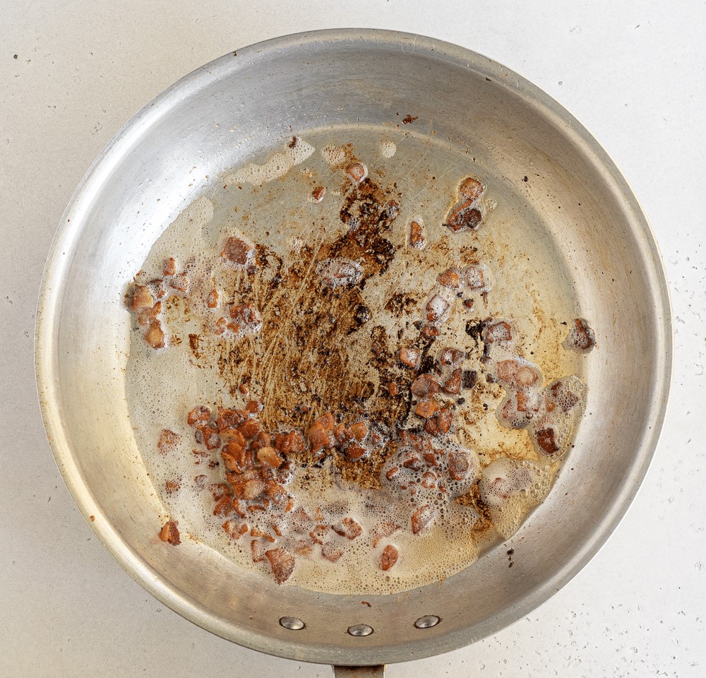 Chop the bacon into small pieces, about ½” in size. In a large sauté pan, cook the bacon over medium heat until browned and crunchy, then use a slotted spoon to transfer it to a plate lined with paper towels. As the bacon is cooking, warm a saucepan over medium heat. Add the chicken stock, let it come to a gentle simmer, then turn the heat to low to keep it warm. In the same sauté pan used to cook the bacon, add the olive oil. Add onion, and mix it into the olive oil and remaining bacon fat, scraping the browned bits from the bottom of the pan into the onion as it cooks. Add a pinch of salt to the onion and cook for 3-4 minutes, until softened.