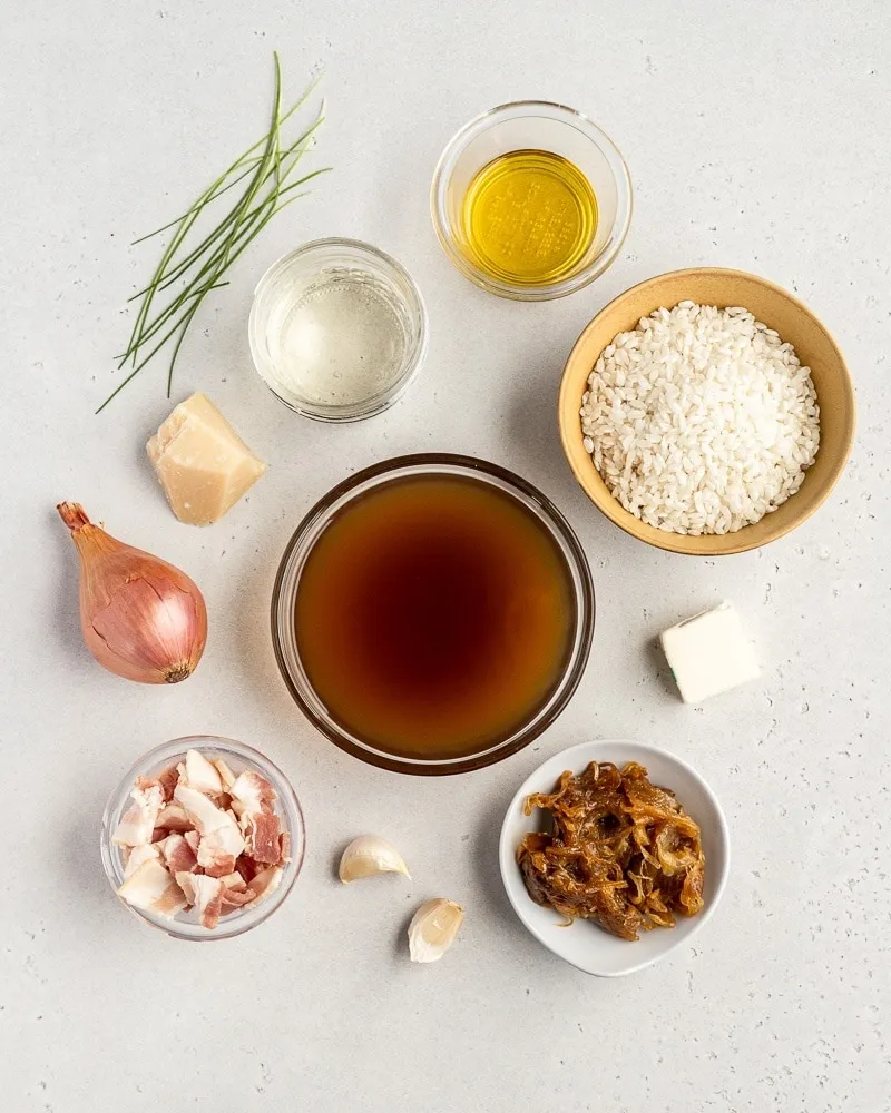 Creamy risotto with caramelized onions, smoky bacon, and delicious parmesan. an elegant comfort food meal for dinner tonight!