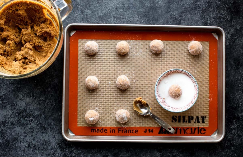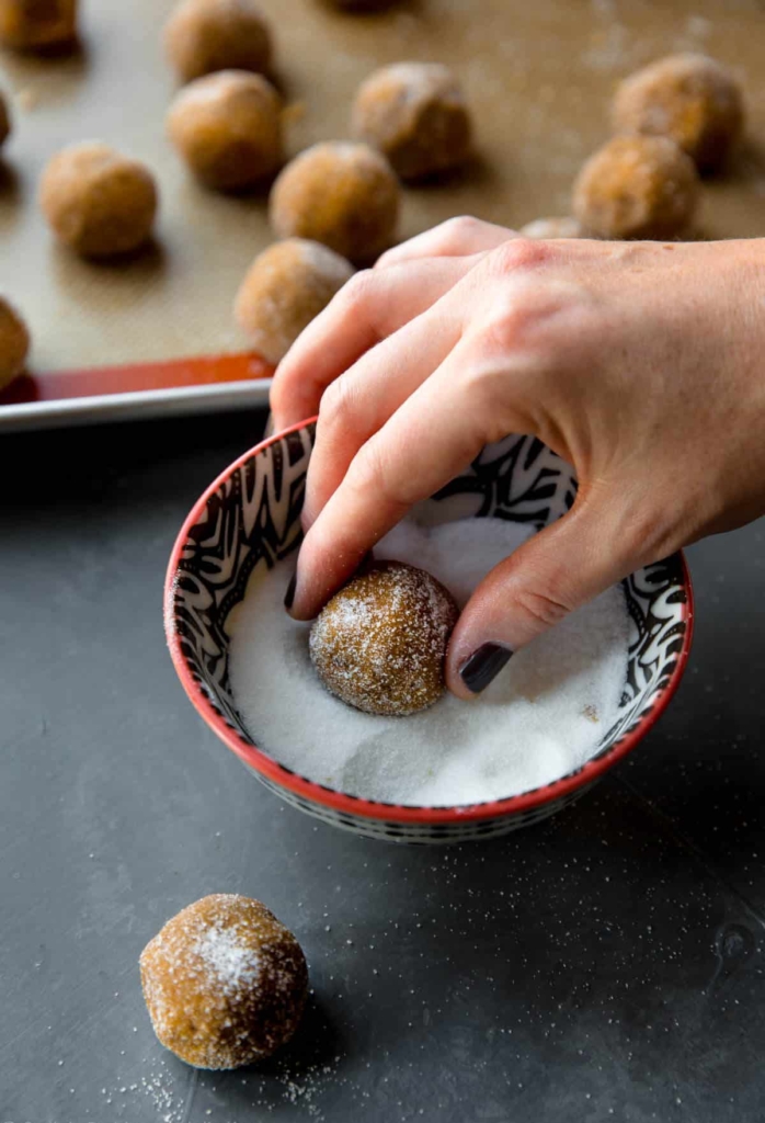 Remove cookie dough from the refrigerator. If the cookie dough chilled longer than 2 hours, let it sit at room temperature for at least 30 minutes. The cookies may not spread in the oven if the dough is that cold. Roll cookie dough, 1 Tablespoon each, into balls. Roll each in granulated sugar and arrange 3 inches apart on the baking sheets. Bake for 11–12 minutes or until edges appear set. If the tops aren’t appearing cracked as pictured, remove the baking sheet from the oven and gently bang it on the counter 2–3x. This will help those warm cookies spread out and crack on top. Return to the oven for 1 additional minute.